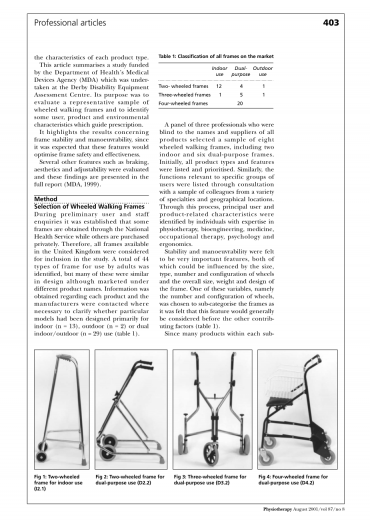本文总结了由卫生部医疗器械署(MDA)资助的德比残疾设备评估中心进行的一项研究。其目的是评价一个有代表性的轮式行走架样品,并确定一些用户,产品和环境特征,指导处方。