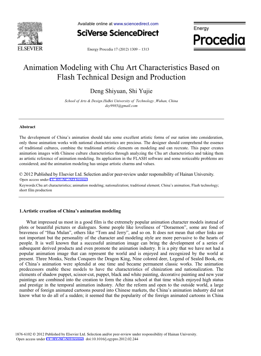 Keywords:Chu art characteristics; animation modeling; nationalization; traditional element; Chinarsquo;s animation; Flash technology; short film production