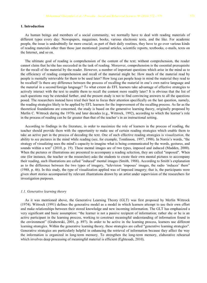 阅读的最终目的是理解文本的内容;没有理解的读者不能声称他/她已经成功完成阅读任务。而且,理解是必不可少的先决条件以供读者回收材料。但是,心智中出现了一些重要的问题阅读理解和回忆材料的效率可能是:读了多少材料人们是精神上可检索的,供他们稍后使用?人们可以记住他们阅读的材料需要多长时间?被召回?用自己的母语回忆材料的过程是否有区别?第二/外语的材料? EFL学习者在多大程度上利用有效的策略积极地与文本交互以使他们稍后更容易地回忆内容?很明显,清单这些问题可能会进一步延伸,而目前的研究并不是要找到所有问题的令人信服的答案构成。相反,研究人员已经尽力将注意力集中在最后一个问题上,即,阅读策略可能被EFL学习者用于改进回忆过程。至于关于理论基础,这项研究是基于生成学习理论,最初由提出Merlin C. Wittrock在20世纪70年代和后来的几十年(例如,Wittrock,1992),根据这个学习者的角色在阅读过程中可以远远大于教师在教学环境中的阅读过程。