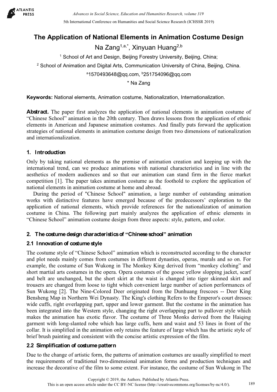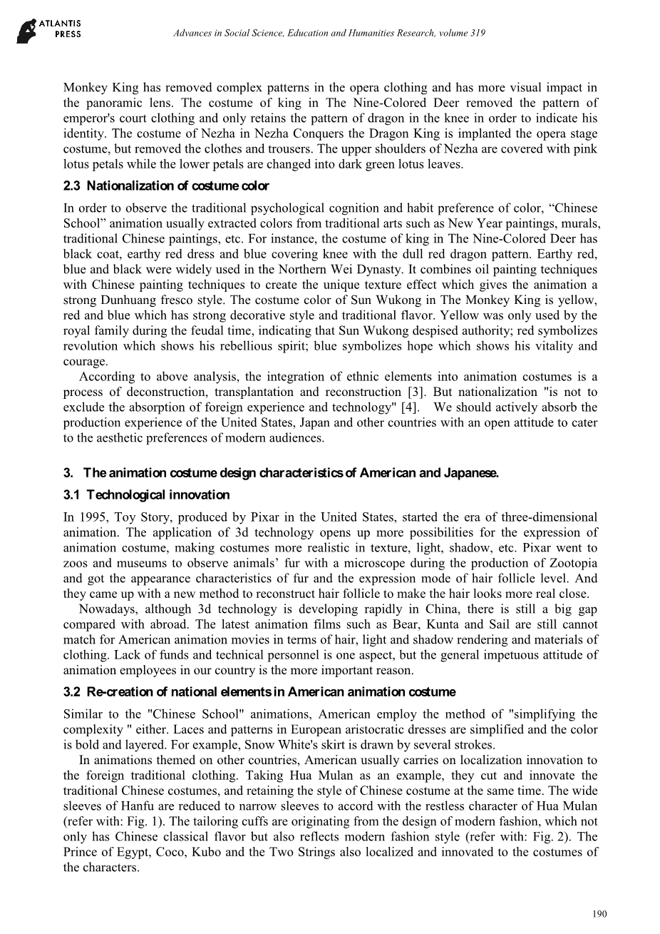 摘要:本文首先分析了民族元素在20世纪“中国学院派”动画服饰中的应用。 然后分析参考了美国和日本动画的服饰中民族元素的运用。 最后从民族化和国际化两个维度提出民族元素在动画服装设计中的应用策略。