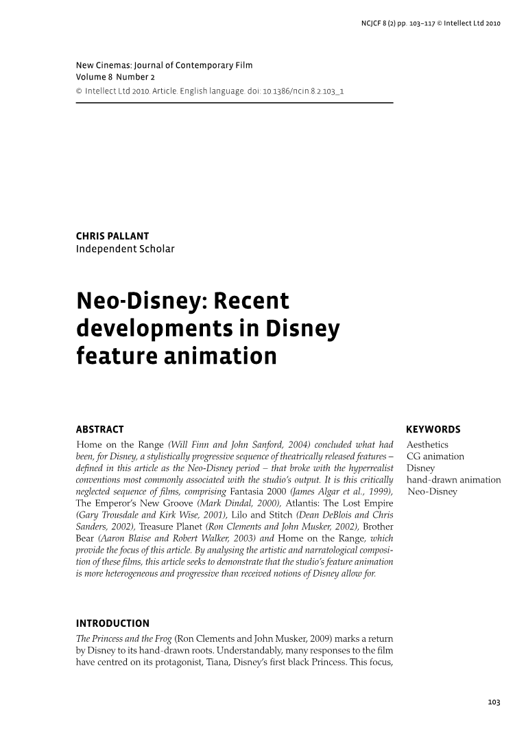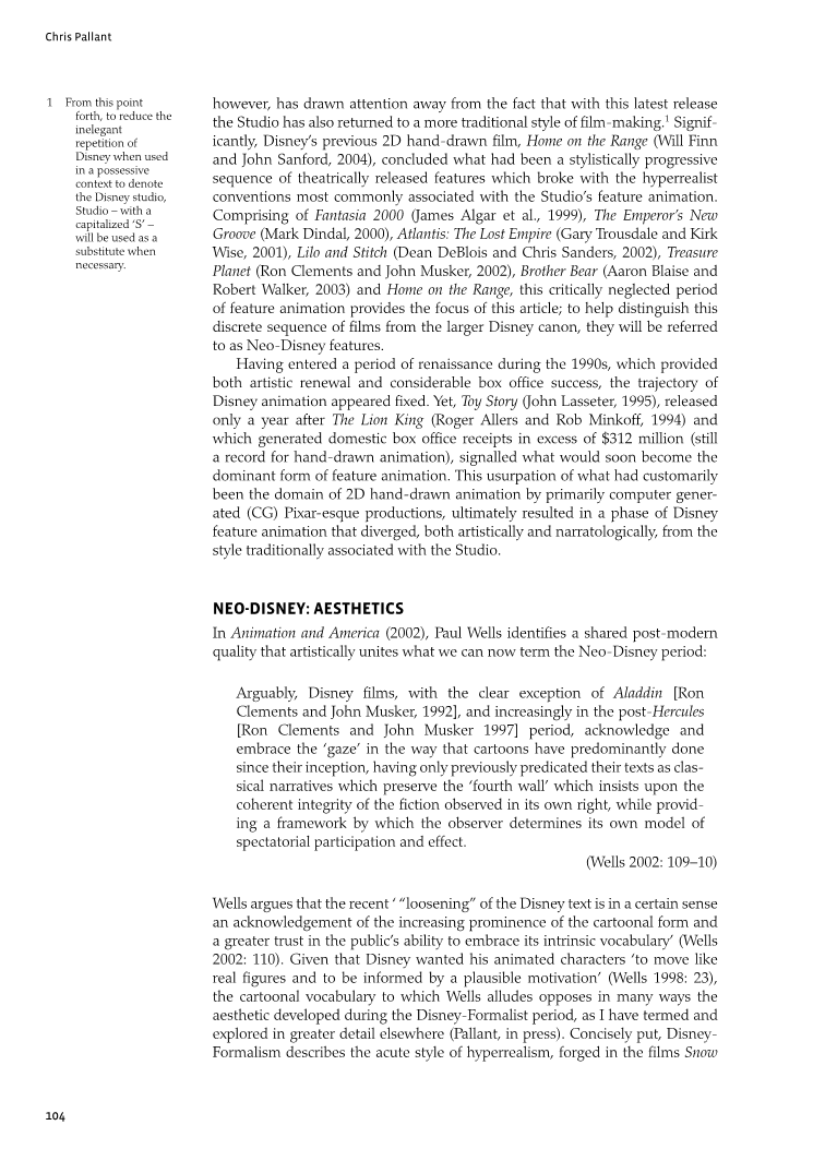 《公主与青蛙》(Ron Clements和John Musker,2009)标志着迪斯尼回归其手绘的根基。可以理解,很多人对这部电影的反应都集中在它的主人公,迪斯尼的第一位黑人公主蒂娜身上。然而,这一焦点已经引起了人们的注意,因为这部最新的电影上映后,制片厂也回归到了更为传统的电影制作风格。值得注意的是,迪士尼之前的二维手绘电影《牧场是我家》(Will Finn和John Sanford,2004年),总结出了一个风格上不断进步的系列戏剧化的功能,打破了超现实主义的惯例,最常见的是与工作室的功能动画。包括幻想曲2000(James Algar等人,1999年)、变身国王(Mark Dindal,2000年)、亚特兰蒂斯:失落的帝国(Gary Trousdale和Kirk Wise,2001年)、星际宝贝(Dean DeBlois和Chris Sanders,2002年)、星银岛(Ron Clements和John Musker,2002年)、熊的传说(Aaron Blaise和Robert Walker,2003年)和牧场是我家,这一被严重忽视的时期的动画是本文的重点;为了帮助将这种离散的电影序列与较大的迪斯尼佳能区分开来,将它们称为“新迪斯尼”功能。