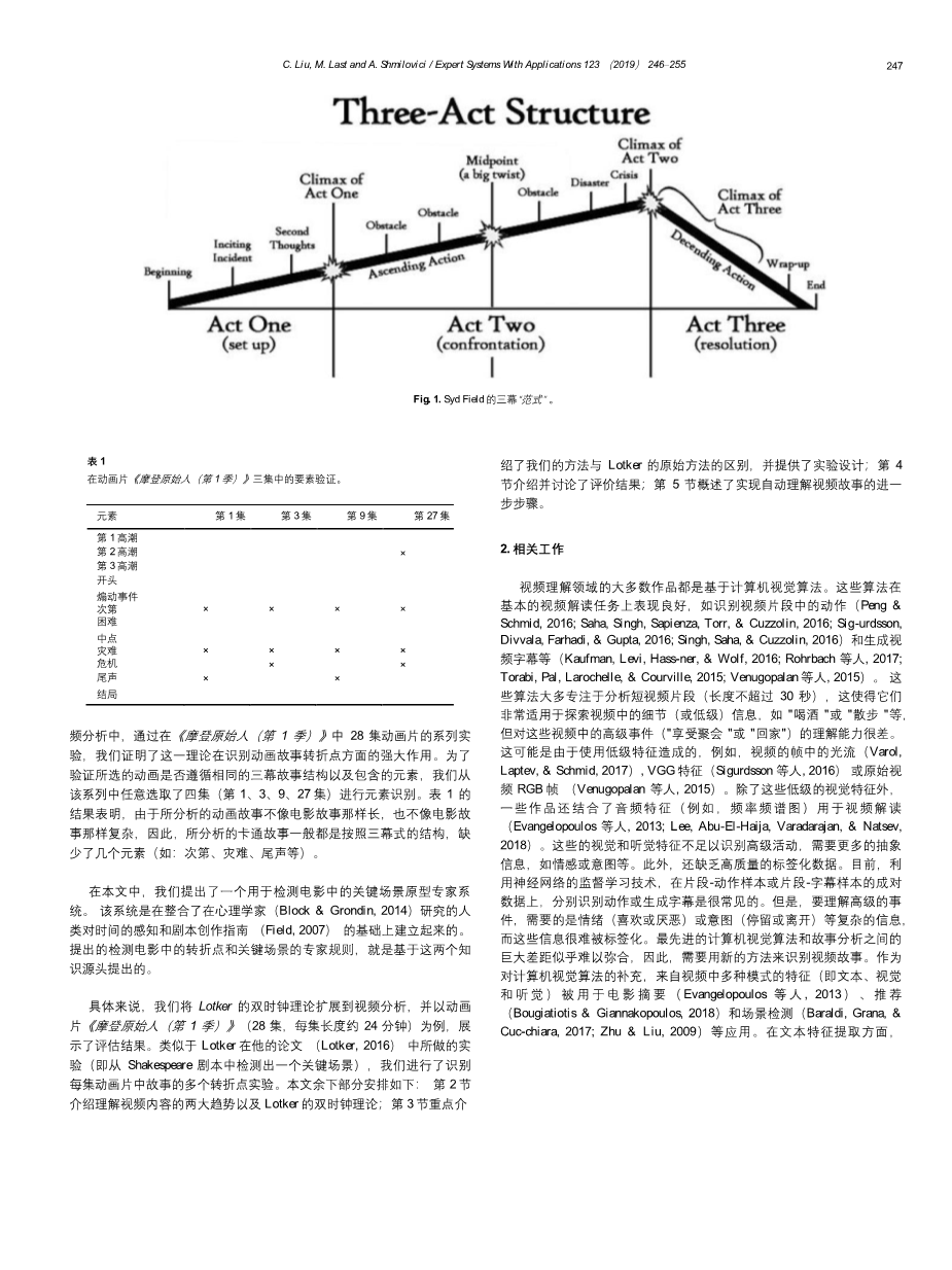 According to the widely used three-act Paradigm 叶 ,a concepshy; tual scheme of scriptwriting/story-writing, a good story is comshy; posed of three main acts and each of them plays a different role in the story ( i.e., the set up, confrontation, and resolution ) (Field, 2007 ), as shown in Fig. 1. There are different elements within the three-act structure, such as climaxes, midpoint, beginshy; ning, inciting incident, second thoughts, obstacles, disaster, wrapshy; up and E时,which construct the main framework of a story. With the ultimate goal of understanding stories in videos, we start by identifying important story elements. ln this paper, we build upon an innovative two-clocks theory from Lotker (2016 ) that is aimed at detecting one key event in a narrative work (e.g., a movie script or a theater play) to identify multiple turning points of cartoon stories. This is the first application of the two-clocks theory to