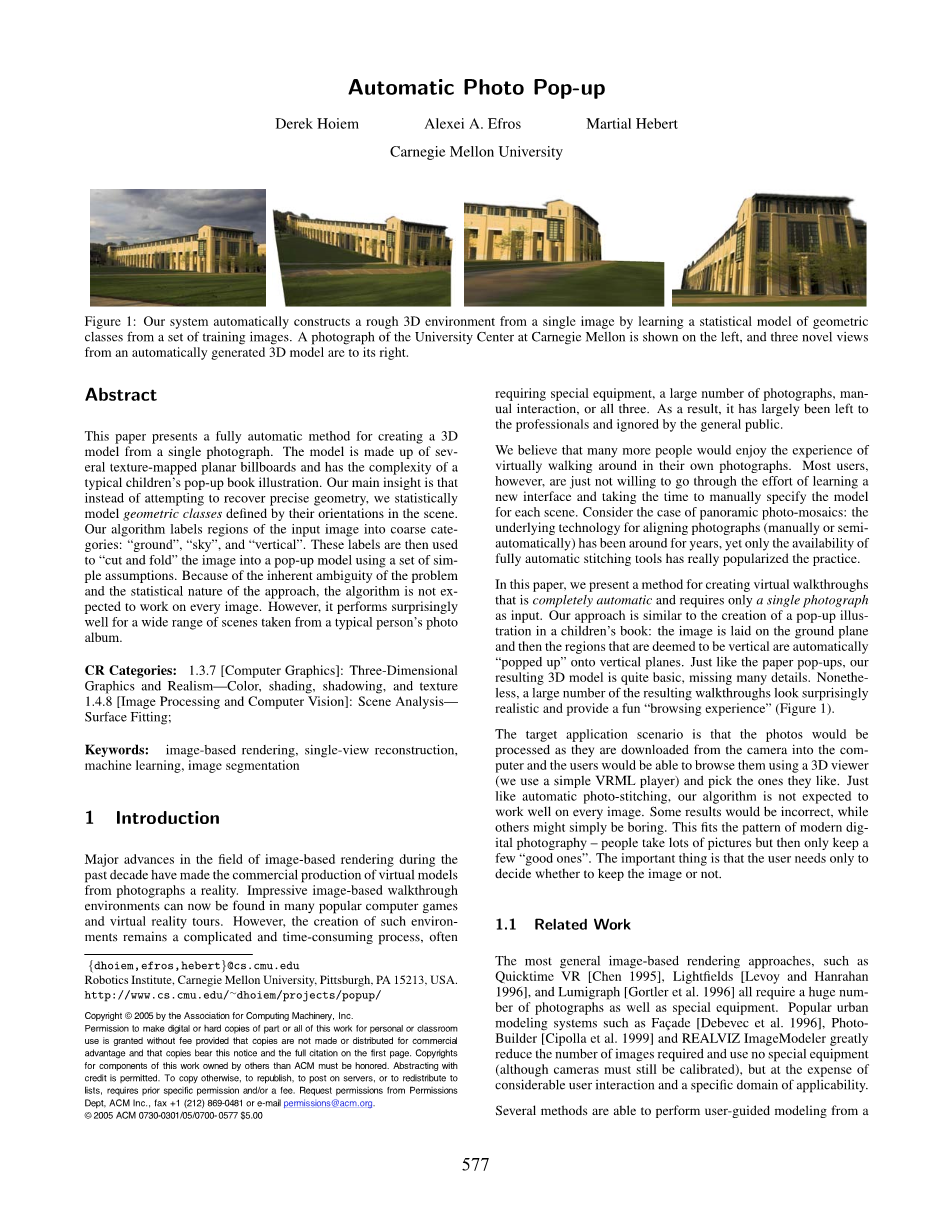 在基于图像的渲染领域的重大进展过去十年已经取得了商业化生产的虚拟模型从照片的现实。令人印象深刻的图像漫游现在可以在许多流行的电脑游戏中发现环境和虚拟现实旅行。然而,创造这样的环境仍然是一个复杂和耗时的过程,往往需要特殊设备,大量照片,说明书互动,或所有三。因此,它在很大程度上是留给专业人士,被广大市民忽视。我们相信,更多的人将享受的经验几乎走在自己的照片周围。大多数用户,然而,只是不愿意通过努力学习新的接口,并采取时间手动指定模型对于每一个场景。考虑全景照片马赛克的情况:调整照片的基础技术(手动或半自动)已经存在多年,但只有可用性全自动拼接工具真正推广了实践。在本文中,我们提出了一个用于创建虚拟漫游的方法这是完全自动的,只需要一个单一的照片作为输入。我们的方法类似于创建一个弹出的插图在儿童书中:图像被放置在地平面上然后被认为是垂直的区域自动“弹出”到垂直平面上。就像报纸上的流行音乐,我们由此产生的3D模型相当基础,缺少很多细节。尽管如此,大量的演练惊心动魄现实和提供一个有趣的“浏览体验”(图1)。目标应用程序的场景是,照片将处理,因为他们是从相机下载到电脑用可以使用3D浏览器浏览它们(我们使用一个简单的VRML播放器),选择他们喜欢的只是像自动照片拼接,我们的算法是不希望在每个图像上工作良好。有些结果是不正确的,而其他人可能只是无聊。这符合现代数字模式摄影-人们拍了很多照片,但只保留很少有“好的”。重要的是,用户只需要决定是否保留形象.