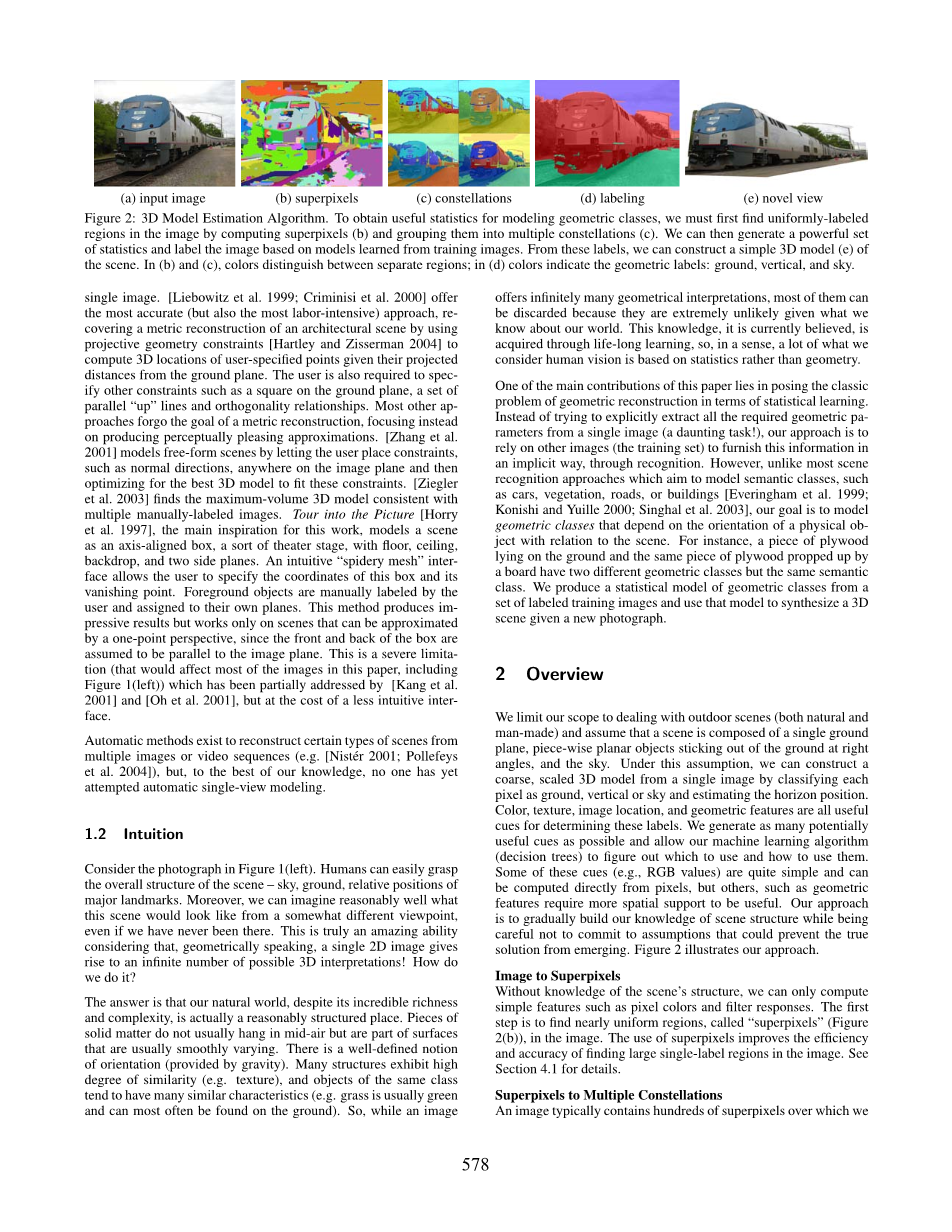 .2直觉考虑图1中的照片(左)。人类很容易掌握场景的整体结构-天空,地面,相对位置主要景点。此外,我们可以合理地想象什么这个场景看起来有点不同,即使我们从未去过那里。这真是一个惊人的能力考虑到几何上说,一个单一的2D图像给出上升到无限可能的三维解释!如何做我们这样做?答案是我们的自然世界,尽管它令人难以置信的丰富和复杂性,实际上是一个合理结构的地方。件固体物质通常不挂在半空中,而是表面的一部分通常是平滑变化的。有一个明确的概念定向(由重力提供)许多结构表现出高相似程度(如纹理)和同一类的对象往往有许多相似的特征(例如草通常是绿色的)最常被发现在地上)。所以,当图像提供无限多的几何解释,其中大部分可以被丢弃,因为他们是极不可能的了解我们的世界。这种知识,目前认为,是通过终身学习获得的,所以,在某种意义上,很多我们考虑人类视觉是基于统计而不是几何。本文的主要贡献之一在于摆出经典统计学习中的几何重构问题。而不是试图明确地提取所有所需的几何参数从一个单一的形象(一个艰巨的任务!),我们的做法是依靠其他图像(训练集)提供这些信息一种含蓄的方式,通过识别。然而,不像大多数场景识别方法,其目的是建模语义类,例如汽车、植被、道路、建筑物或[埃弗灵厄姆等人。1999;Konishi和尤尔2000;Singhal et al.。2003、我们的目标是模型依赖于物理对象的方向的几何类与场景有关。例如,一块胶合板躺在地上和同一块胶合板支撑着董事会有两个不同的几何类,但相同的语义类。我们产生一个统计模型的几何类一组标记的训练图像,并使用该模型合成3D给一张新照片的场景。