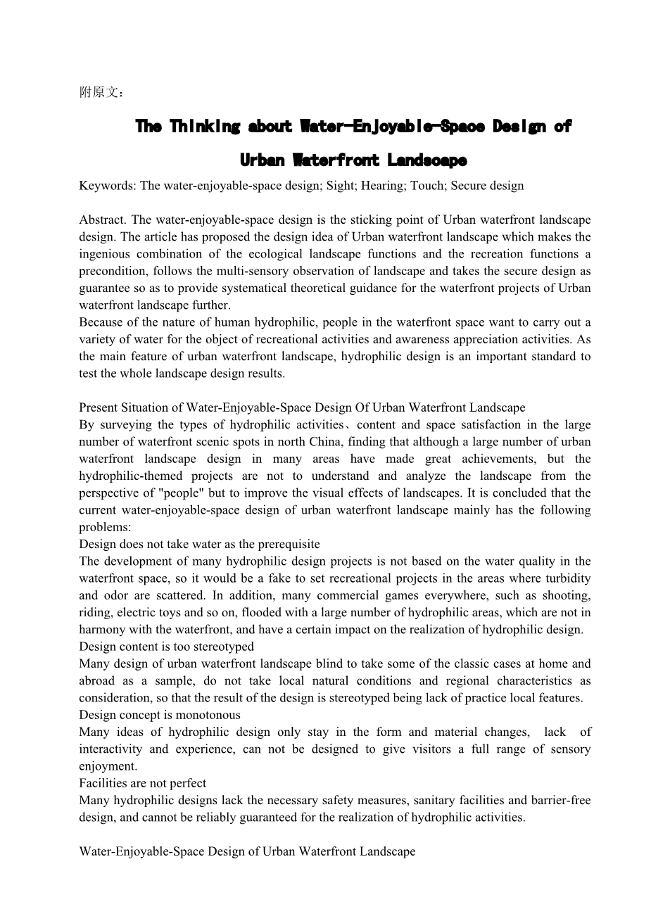 摘要:享受水的空间设计是城市滨水景观设计的重点。文章中作者提出了城市滨水景观的设计思路:以生态景观功能与游憩功能的巧妙结合为前提,遵循景观的多感官观察,以安全设计为保证,提供系统的理论指导,进一步用于城市滨水景观的滨水项目。