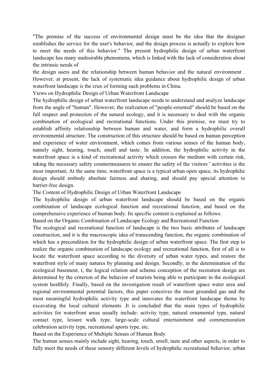 “环境设计成功的前提必须是设计师为用户的行为喜好建立服务,而设计过程实际上是在探索如何满足这种行为的需求。”当前的城市滨水景观亲水设计存在许多不良现象,这与缺乏对设计用户的内在需求以及人类行为与自然环境之间关系的考虑有关。 但是,目前在中国,缺乏对城市滨水景观亲水性设计的系统性思想指导是形成此类问题的症结所在。