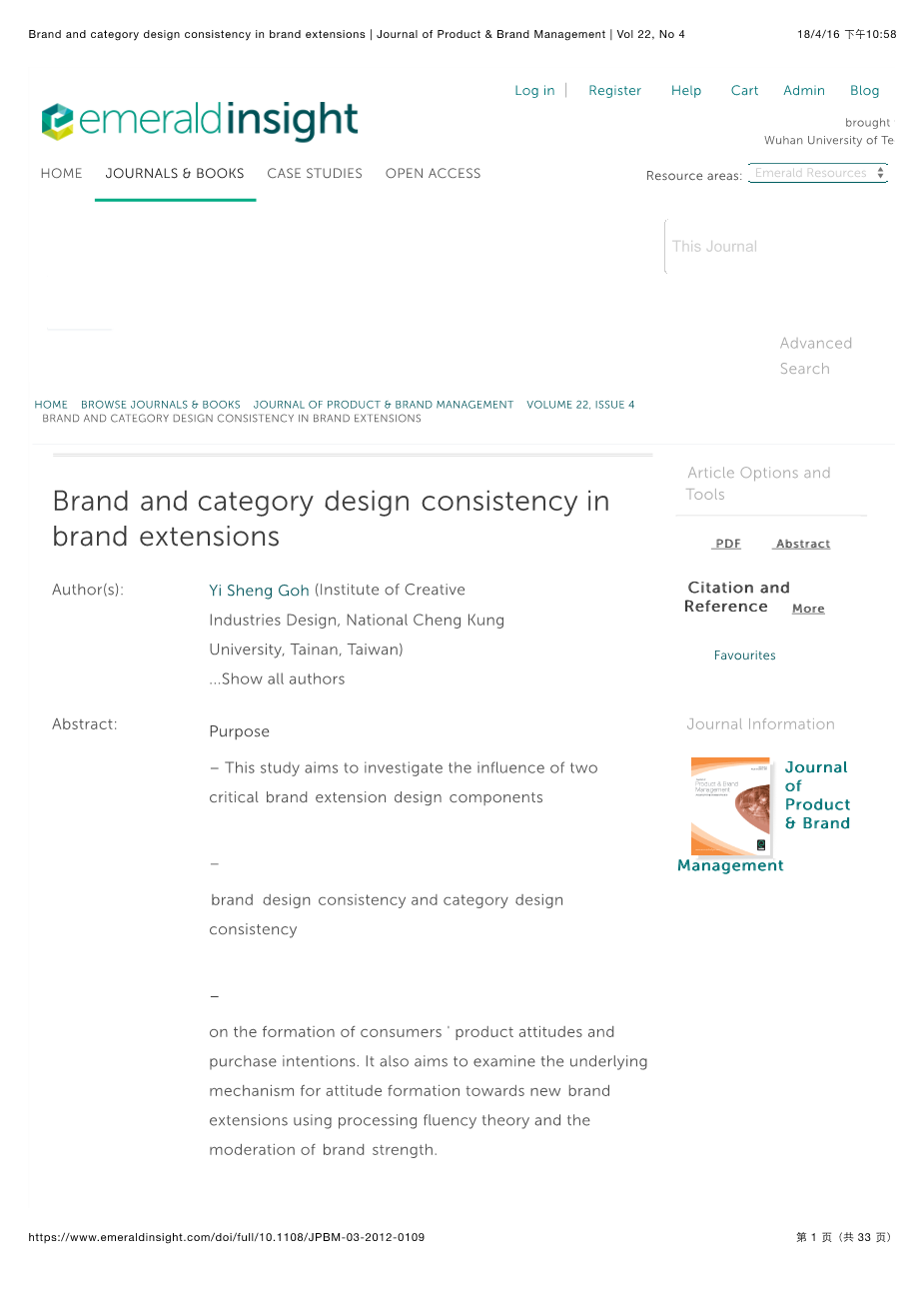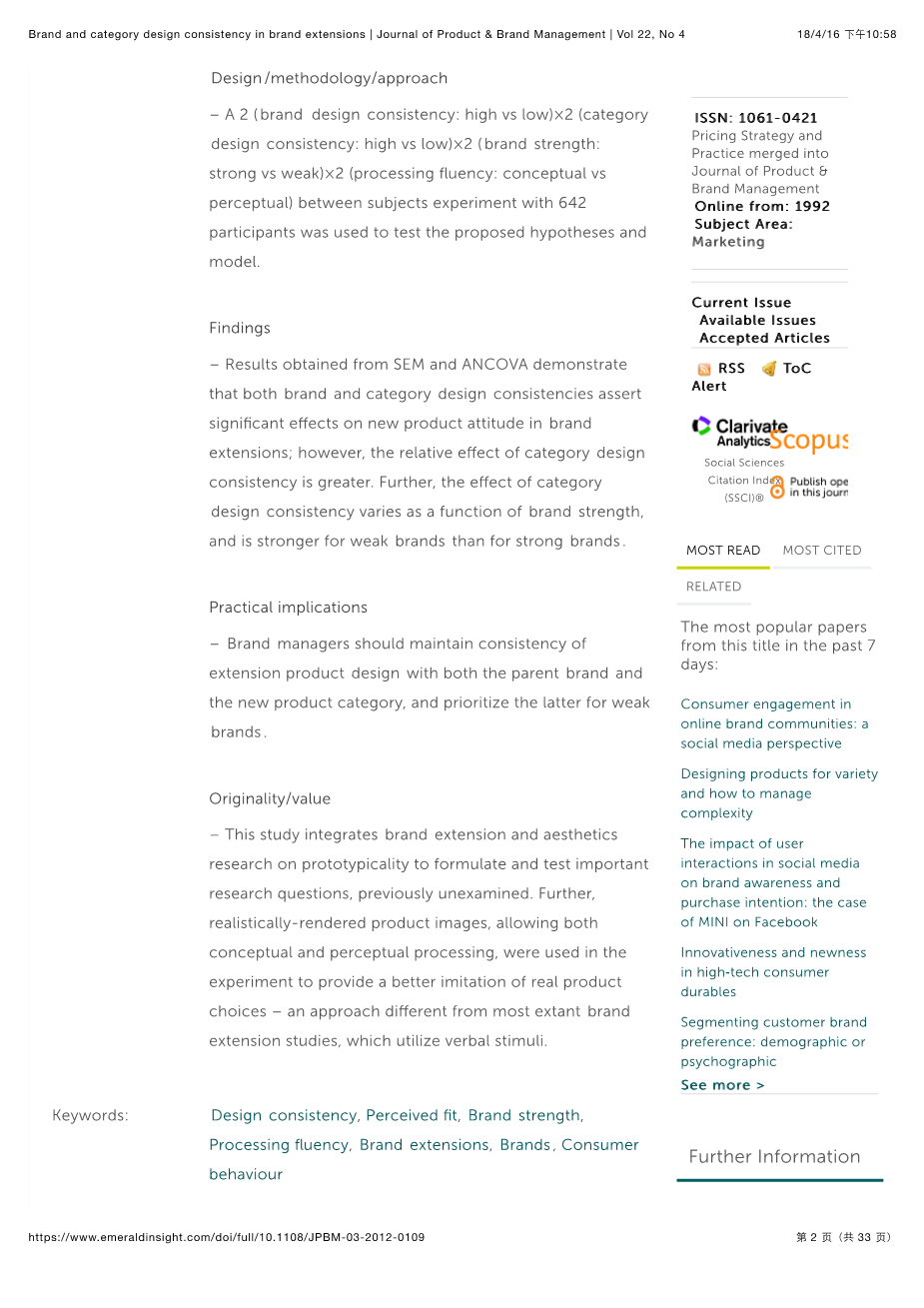 本篇论文关于消费者产品态度和购买意向的形成。 它还旨在通过加工流畅性理论和品牌实力的调节来考察对新品牌延伸态度形成的基本机制。
