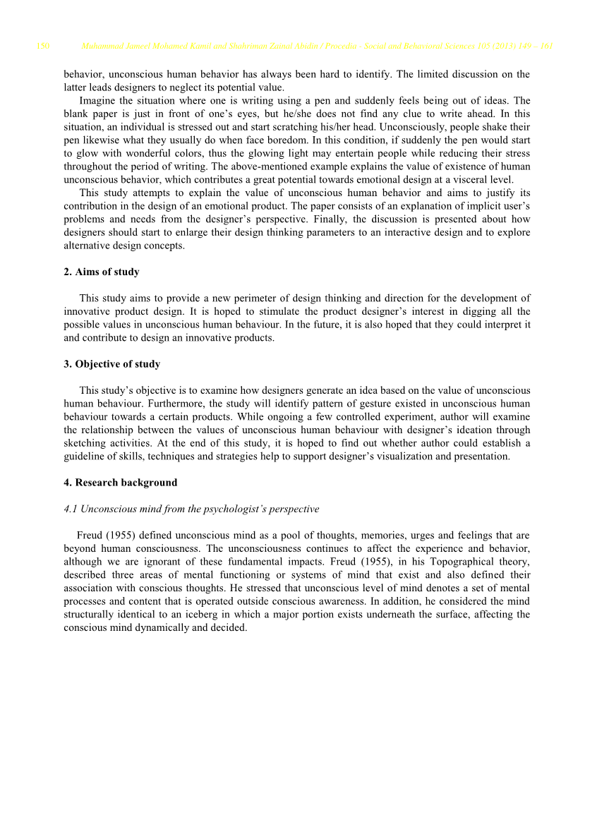 该研究的目标是研究设计师如何根据无意识的人类行为的价值产生一个想法。 此外,这项研究将确定在无意识的人类行为中对某种产品存在的手势模式。在进行一些对照实验的同时,作者将通过画草图来研究无意识的人类行为的价值与设计者的认知之间的关系。在本研究结束时,希望了解作者是否能够建立技能,技巧和策略的指导方针,以帮助支持设计师的可视化和展示。