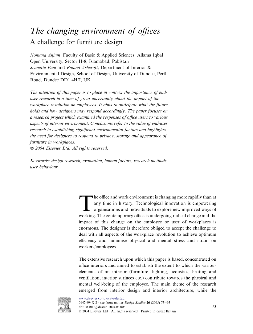 本文的目的是在工作场所公转对雇员的影响不确定的时间内,对终端用户研究的重要性进行阐述。它旨在是预测未来会发生什么,以及设计师如何做出相应的反应。本文重点介绍了一个研究项目,该项目研究了办公室用户对室内环境各个方面的反应。结论涉及到终端用户研究对于建立重要环境因素的重要性并且强调了设计师对于公共场所家具的隐私、储存和外观的需求。