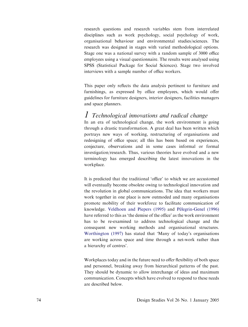 工人们必须在一个地方工作的想法现在已经过时了,很多组织都在促进员工的流动性以促进知识的交流。Veldhoen和Piepers(1995)和Pe#39;legrin-Genel(1996)将此称为'办公室的消亡',因此,必须重新审视工作环境,以应对技术变革以及由此产生的新工作方法和组织结构。Worthington(1997)曾说过,“如今的许多组织都是通过网络而不是中心的等级来跨越时空的。”