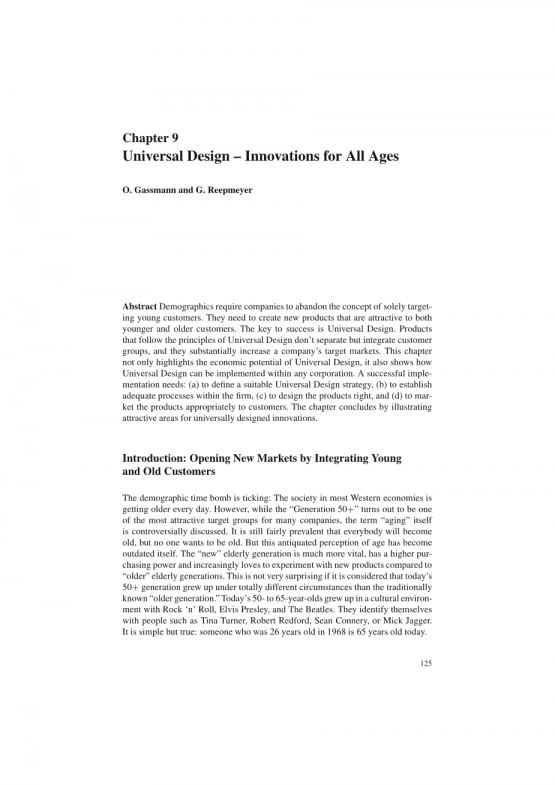 在这种背景下,创新管理最近开始参与新的“通用设计”范式。通用设计的产品对所有客户都有吸引力,与他们的年龄无关。通用设计集成。它不能区分残疾人、正常人、老年人和年轻人。通用产品考虑到所有可能的用户和客户的需要和要求。因此,通用设计在概念上代表了一个标准,而不是一个例外。通用设计故意避免突出用户和客户的不同功能。一个30岁的孩子不会买一辆为一位60岁老人开发的汽车。然而,这位60岁的老人也不会买这辆车。通过提供独立于用户年龄的产品,公司最终可以最大限度地扩大其可能的目标客户。