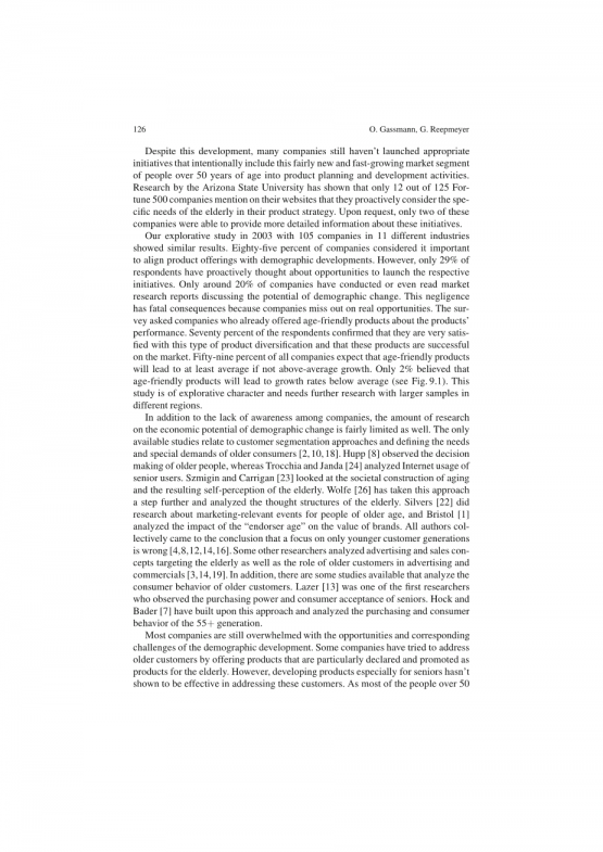 这使得公司除了开发独立于客户年龄的产品和服务之外,别无选择。这些产品和服务需要将产品需求(逻辑、复杂性、维度、功能、处理)与老年人的特殊能力(感官和认知能力、精神敏捷性、身体状况、技术经验)结合起来。成功的创新遵循的座右铭是:“为年轻一代创造产品不包括老年人。然而,为所有年龄的人创造产品,包括了所有的世代-年轻的和年老的。