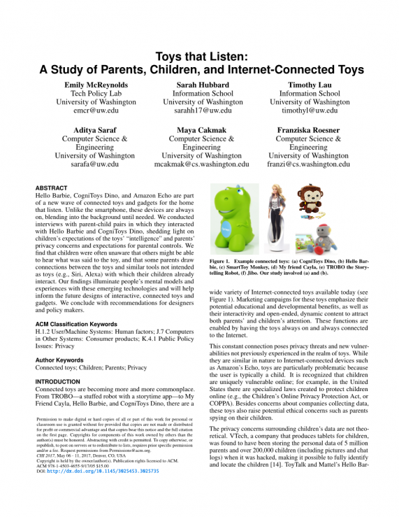 以声音连接家中玩具和智能终端是现今的新潮流,其中代表有你好芭比、Cognitoy恐龙和亚马逊回声。和智能手机不同,这些有声服务时时在线,在不使用时与环境融为一体。我们采访了亲子们对你好芭比和Cognitoys恐龙的游戏体验,反馈集中于孩子们对玩具 '智能' 的期望和家长对隐私保护能力和监护功能的关心。我们发现孩子们通常注意不到他们和玩具的悄悄话能被别人听到,有些家长发现孩子将其他不算是玩具的相似工具(如Siri、Alexa)作为玩具玩耍。我们利用这些发现阐明了人们与这些新兴技术的心理模式和使用经验, 这将有助于互动, 互联网玩具和小工具的未来设计。