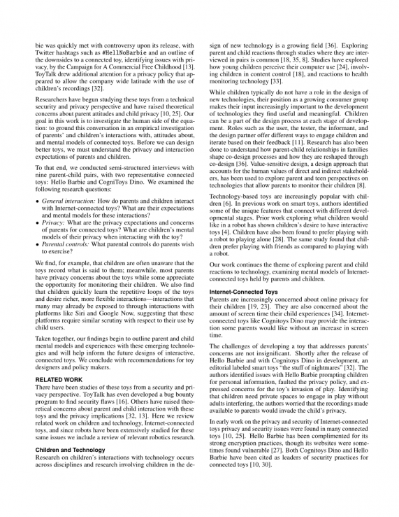 我们关于你好芭比是否可以保守秘密的研究主要对玩具尊重儿童隐私的能力进行了考察。相比你好芭比娃娃与Furbie公司过去的二十年其他的前卫玩具, 研究人员指出, 记录和分享用户的对话的功能区分在你好芭比上是过时的。他们的结论是, 广泛共享数据可能会对儿童的信任产生负面影响, 危害父母管理其子女信息的权力。同样的, 最近向联邦贸易委员会提出的关于我的朋友卡拉 (一个类似于我们研究的玩具)的投诉,突出了这些玩具的几个安全挑战。最后, 最近一份未来隐私论坛和家庭在线安全研究所的白皮书探讨了互联玩具和互联家庭对儿童隐私的潜在影响, 包括《儿童在线隐私保护法》 (COPPA)。