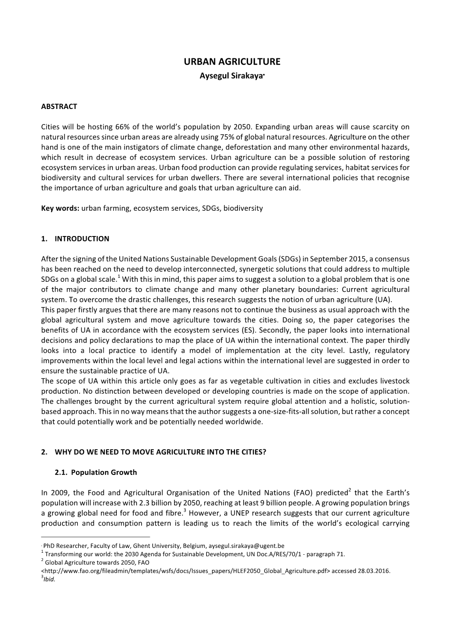 到2050年,城市将容纳66%的世界人口。而目前城市地区已经使用了全球75%的自然资源,扩大城市面积将导致自然资源短缺。另一方面,农业是气候变化、森林砍伐和许多其他环境危害的主导因素之一,这些危害导致了生态系统服务被破坏。城市农业是恢复城市生态系统服务的一种可能的解决方案。城市粮食生产可以为城市居民提供调节服务、生物多样性栖息地服务和文化服务。并且已经有几项国际政策表明认识到了城市农业的重要性和其可以帮助的目标。