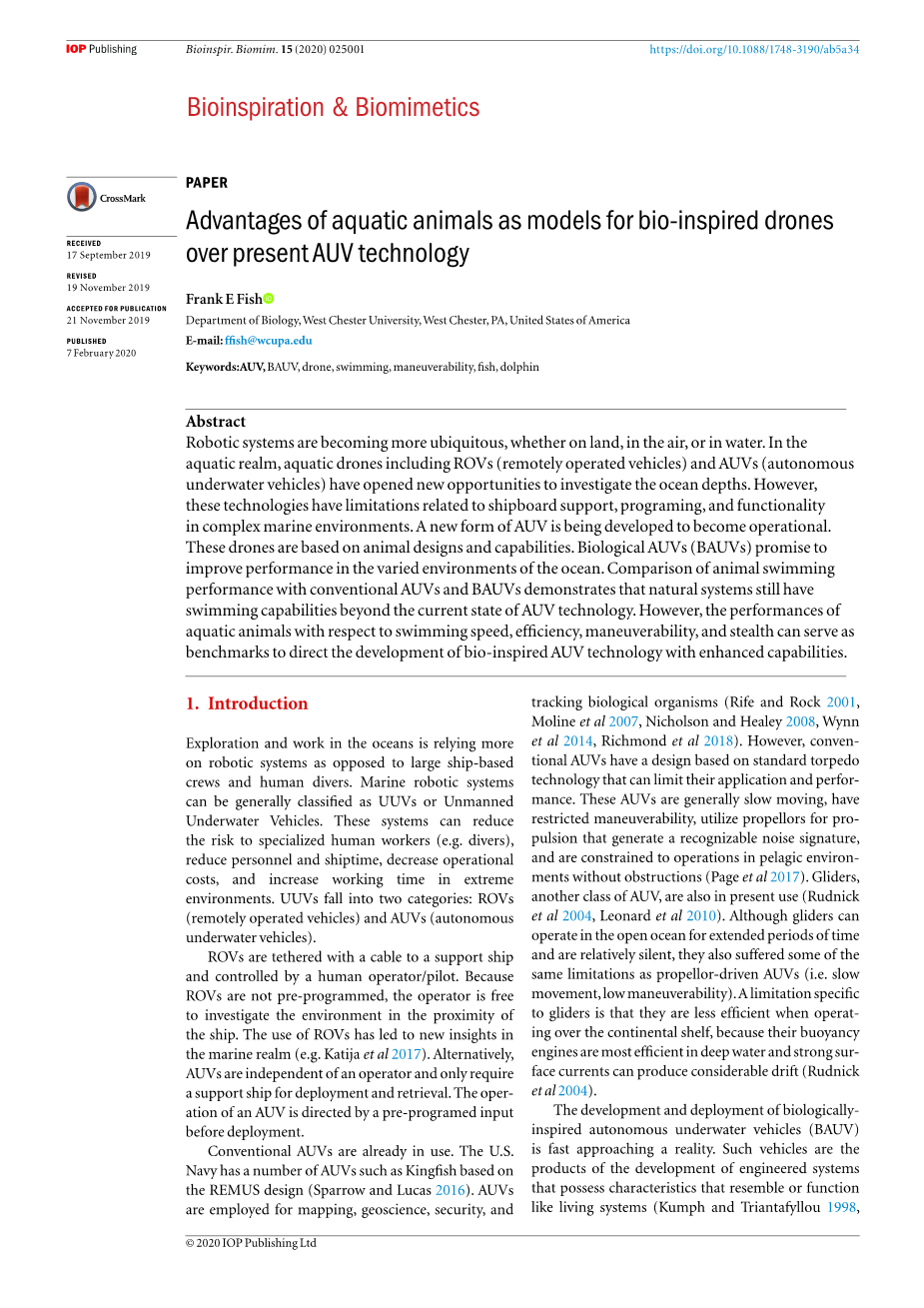 本文试图证明,与目前的AUV和BAUV相比,动物在水中仍然表现出更好的运动性能。通过将动物的表现作为基准,BAUV可以被设计改造成达到或超过这一目标。因此,以动物形态和生理的分析作为模板,来集中设计具有特定任务能力的自主水下无人机,要检查和比较的关键性能特征包括:速度、效率、机动性和隐身性能。Murphy和Haroutunian(2011)的一篇综述对现有水下机器和动物进行了类似的参数检查,但只有对水下机器性能的预测被用于比较。本综述将利用当前功能性BAUV的数据,对性能的比较进行更新。由于大多数的BAUV是基于鱼的功能进行设计(例如,金枪鱼和海豚),这些动物将是本报告的主要比较对象。