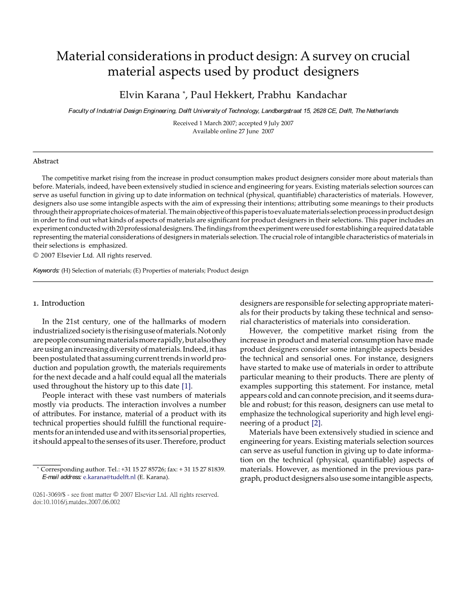 材料在科学和工程领域已经广泛研究多年。现有的材料选择资源非常有用,可以专门提供关于材料的技术(物理、可量化)方面的最新信息。然而,如前一段所述,产品设计师在选择材料的时候也考虑一些无形的方面,来达到他们的设计意图。相反,虽然选择材料的时候这些无形的方面对设计师来说是至关重要的饿,但是目前的材料选择资源并没有考虑到这些,也没有提供涉及到这些方面的一个系统的研究方法。Ashby和Johnson提到过,对于工程师来说,获得他们需要的信息很方便——书本,软件,材料供应商的公开服务——也可以用来为安全经济的设计提供分析。但是,他们也说道,现在的产品设计师没有得到公平的支持,因为没有给产品设计师提供类似的工具。