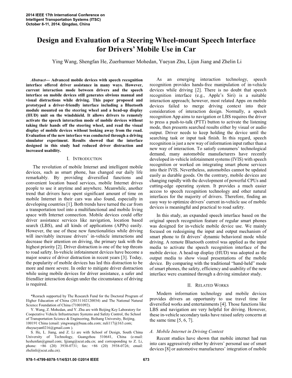 移动互联网和智能手机等智能移动设备的革命,极大地改变了我们的日常生活。移动互联网通过提供多样化的功能和方便的基于位置的服务,推动人们随时随地使用它。与此同时,人们还发现了另一种趋势,即司机在开车时花大量时间在移动互联网上,尤其是在发展中国家[1]。这两种趋势都使汽车从一种交通工具变成了一个多功能的、可移动的、可以上网的生活空间。移动设备可以轻松地提供导航、基于位置的搜索(LBS)和各种应用程序(APPs)等驾驶员辅助服务。然而,在驾驶过程中使用这些新功能将不可避免地增加驾驶员的车内互动,减少他们对驾驶的注意力,这是[2]优先级最高的首要任务。驾驶员注意力分散是道路安全的最大威胁之一。近年来,车载信息娱乐设备已经成为驾驶员注意力分散的主要来源。如今,移动设备的普及使得这种分心变得越来越严重。为了减少驾驶员在使用移动设备辅助驾驶时的分心,需要一种更安全、更友好的驾驶环境下的交互设计。