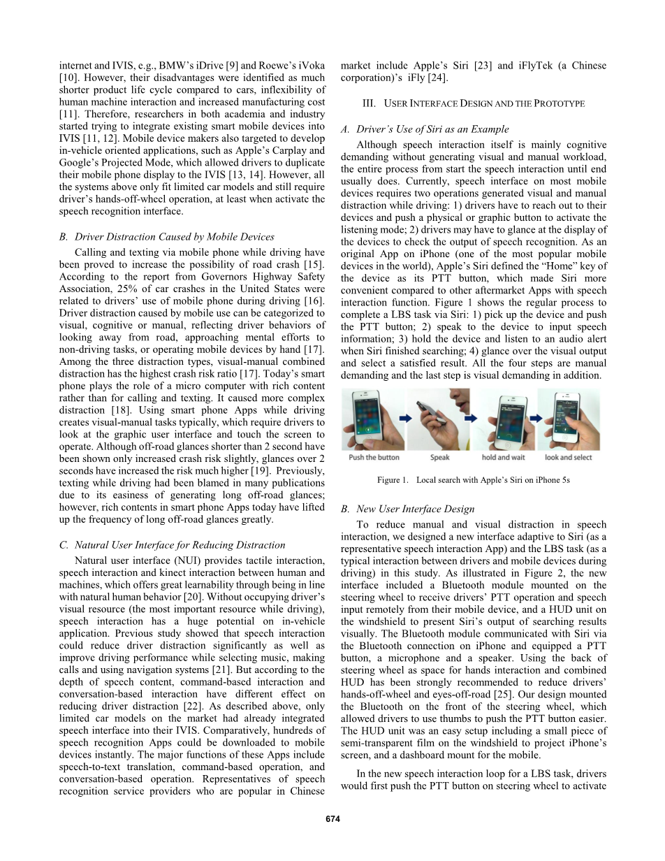 语音识别作为一种新兴的交互技术,在驾驶[2]时提供了对车内设备的免提操作。语音识别界面(如苹果的Siri)无疑是一种合适的交互方式;然而,大多数移动设备上的相关应用都没有将驾驶环境融入到交互设计中。通常情况下,语音识别应用程序的目标是导航或LBS要求司机按下一个按钮-to-talk (PTT)来激活收听模式,然后通过视觉或音频输出显示搜索结果。驱动程序需要一直持有设备,直到搜索任务或输入任务完成。在这方面,语音识别只是一种新的信息输入方式,而不是一种新的交互方式。为了满足消费者的技术需求,许多汽车制造商最近开发了带有语音识别的车载信息娱乐系统(IVIS),或致力于将智能手机服务集成到IVIS中。然而,汽车不可能像耐用品那样容易更新。相反,随着强大的cpu和前沿操作系统的发展,移动设备正在迅速发生变化。它为大多数驱动程序提供了更容易的语音识别技术和其他自然接口。因此,寻找一种简单易行的方法来优化驾驶员目前在车内对移动设备的使用,对道路安全具有重要的现实意义。本研究以普通智能手机原有的语音识别功能为基础,设计了一种扩展的车载移动设备语音界面。我们主要对智能手机的输入输出机制进行重新设计,以适应驾驶员驾驶时的动态行为模式。采用蓝牙遥控作为输入媒体,激活移动设备语音识别界面。采用平视显示器(HUD)作为输出媒体,对移动设备进行可视化显示。通过对驾驶模拟器的研究,与传统的智能手机“手持”模式进行比较,验证了新界面的安全性、效率和可用性。