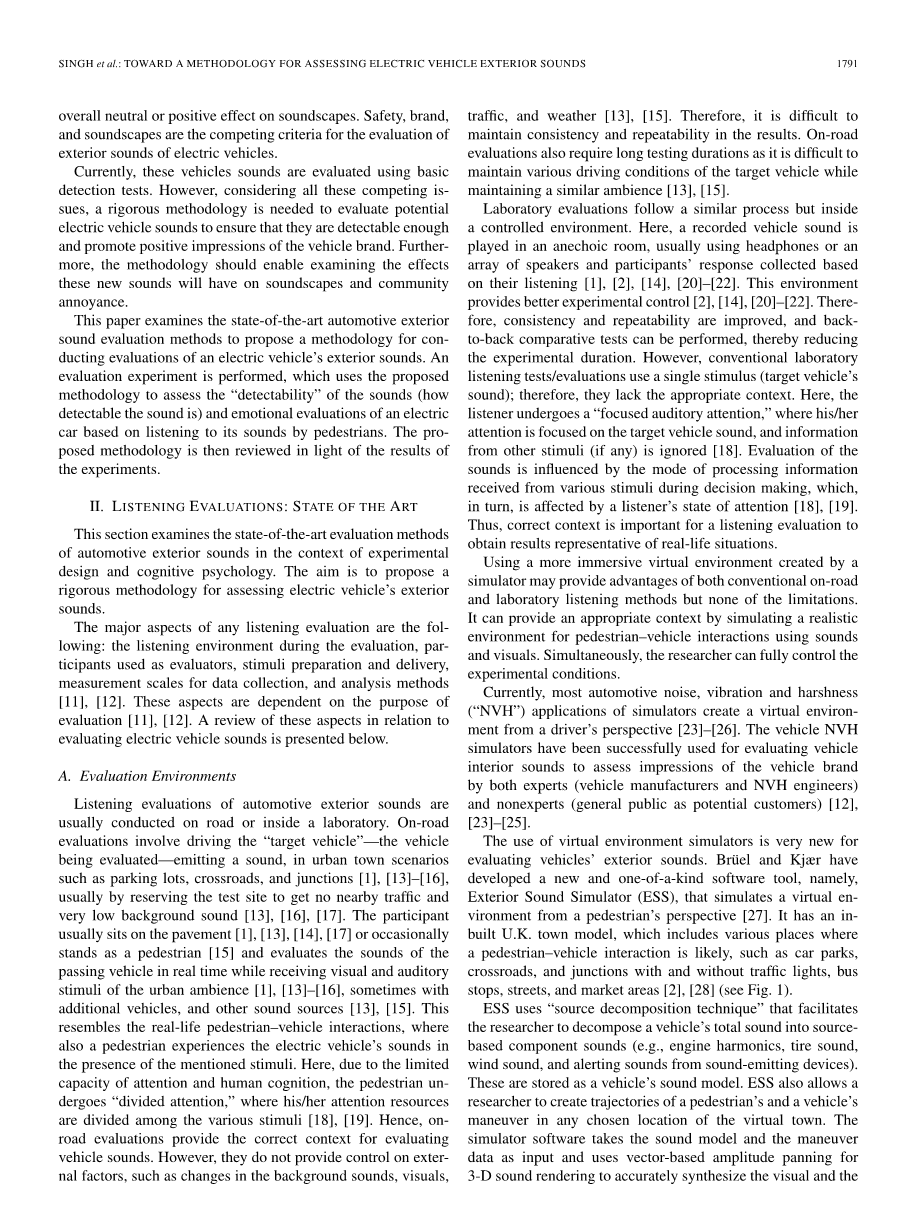 汽车外部声音的听力评估通常在道路上或实验室内进行。道路评估涉及驾驶“目标车辆” - 被评估的车辆 - 在城市小镇场景中发出声音,例如停车场,十字路口和交叉路口[1],[13] - [16],通常通过预留测试现场没有附近的交通和非常低的背景声音[13],[16],[17]。参与者通常坐在人行道上[1],[13],[14],[17]或偶尔站在行人[15]并实时评估过往车辆的声音,同时接收到视觉和听觉刺激。城市氛围[1],[13] - [16],有时还有其他车辆和其他声源[13],[15]。这类似于现实生活中的行人车辆相互作用,行人在存在所述刺激的情况下也会体验电动车辆的声音。在这里,由于注意力和人类认知能力有限,行人经历了“分散注意”,他/她的注意力资源被分为各种刺激[18],[19]。因此,在线评估为评估车辆声音提供了正确的背景。但是,它们不能控制外部因素,例如背景声音,视觉效果,交通和天气的变化[13],[15]。因此,难以在结果中保持一致性和可重复性。道路评估还需要较长的测试持续时间,因为难以维持目标车辆的各种驾驶条件,同时保持类似的氛围[13],[15]。