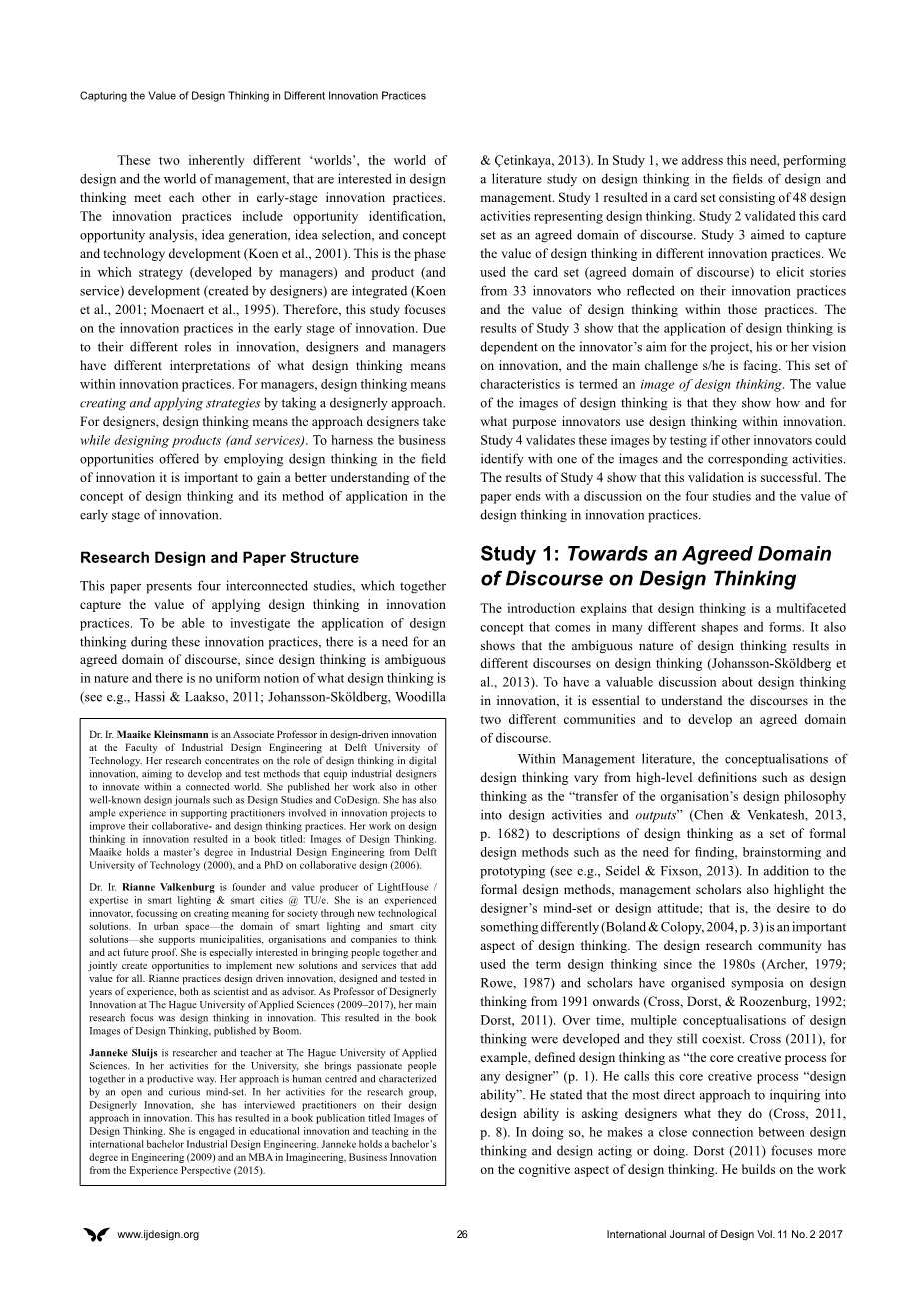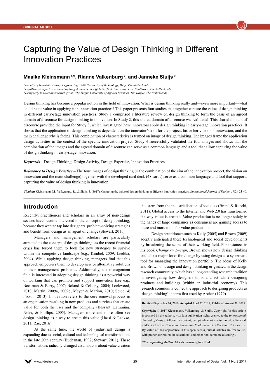 版权: copy; 2017 Kleinsmann, Valkenburg, amp; Sluijs. Copyright for this article is retained by the authors, with first publication rights granted to the International Journal of Design. All journal content, except where otherwise noted, is licensed under a Creative Commons Attribution-NonCommercial-NoDerivs 2.5 License. By virtue of their appearance in this open-access journal, articles are free to use, with proper attribution, in educational and other non-commercial settings.