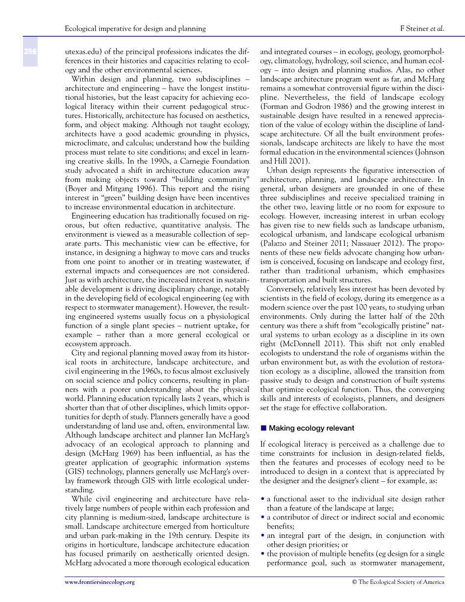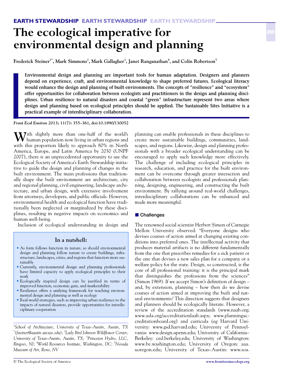 著名的卡内基梅隆大学社会科学家Herbert Simon说:“每个人都在设计谁想出了旨在将现有条件改变为优选条件的行动方案。产生物质文物的智力活动从根本上等同于为患病患者或为公司制定新的销售计划或为国家制定福利政策的人。所以,对构建来说,设计是所有专业训练的核心:它是区分专业和科学的主要标志”。 如果我们接受Simon关于设计的定义,将其扩展到计划——我们如何设计旨在改善建筑和自然环境的行动方案?这个方向表明设计师和规划师应该具备生态素养。然而,主要职业人员评审标准和课程表明他们历史和能力的差异与生态学和其他环境科学有关。
