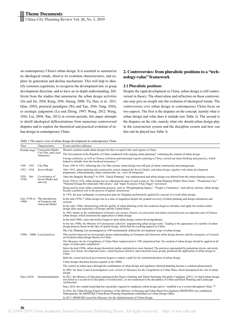 无数历史事实表明,城市设计在当代中国的发展不是一个“白板”过程从1979年开始,但培养在一个复杂的背景下,经历了一个支离破碎而曲折的过程与外界交互频繁(见表1),考虑到,它既不合理进行总结性研究自改革开放以来,也不可能将意识形态的发展概括或描述为一个简单的“线性过程”。如何正确认识城市的发展历史,把握城市的发展规律,特别是观念的演变,已成为当代中国城市设计研究的一个重要课题。要总结其思想倾向,观察其演变特征,揭示其产生和衰落的机制。这将有助于我们认清共同的认识,认识国际反观法的发展趋势,把握发展方向,深入认识国际反观法。(Jin and Jin, 2014; Kong, 2016; Huang, 2006; Yu, Han, et al., 2011,Qiao, 2003)实践范式(Wu and Xue, 2016; Yang, 2016)或者战略判断((Lu and Zheng, 1997; Wang, 2012; Wang,2016; Liu, 2004; Xue, 2012)在特定时期,本文试图从众多有争议的争论中提炼出意识形态的差异,并探索当代中国城市设计的理论和实践演变