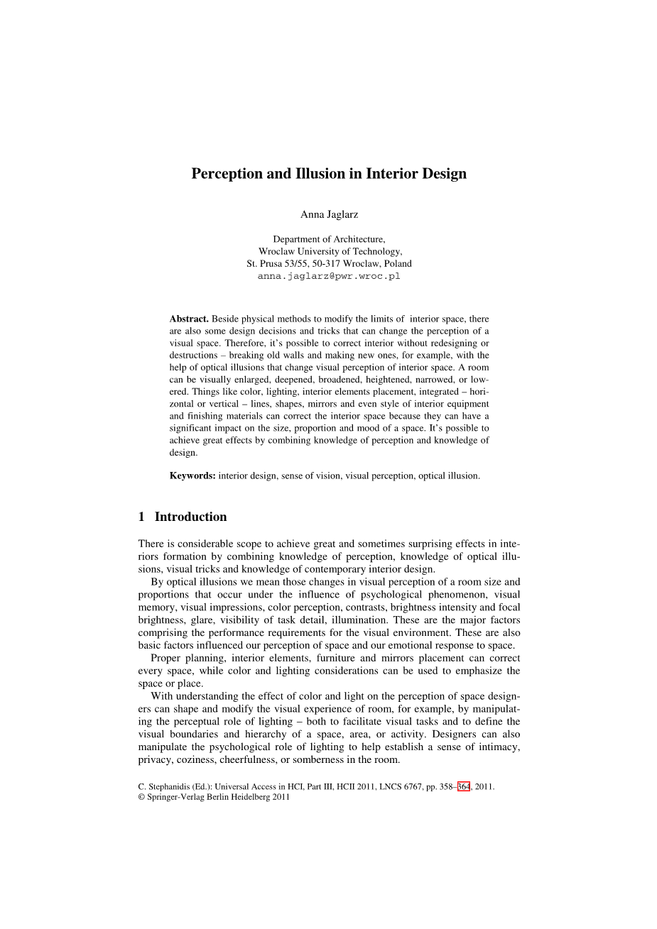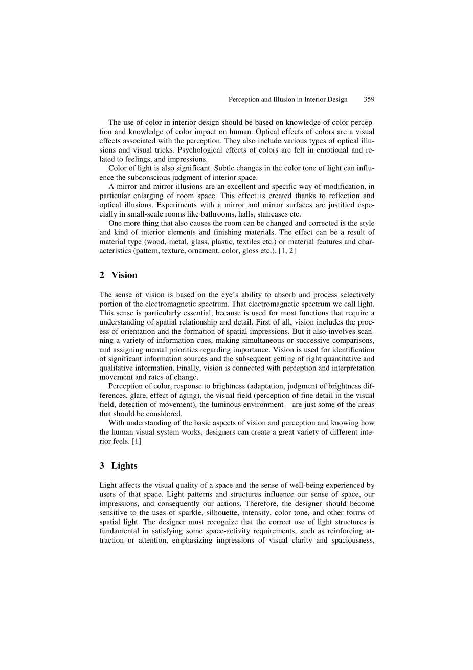 摘要:除了改变内部空间界限的物理方法外,还有一些可以改变视觉空间感知的设计方法和技巧。因此,我们有可能在不进行破坏或重新设计的前提下校正室内空间——例如,借助视觉错觉来改变旧的墙壁并改建新的墙壁,以达到内部空间已改变的视觉感知。利用一些视错觉可以在视觉上放大、加深、加宽、加高或缩小房间。色彩、照明、室内装饰的排列摆放、水平或垂直的集成线、形状、镜子甚至室内设备和装饰材料的样式等东西都可以校正内部空间,因为它们可以对空间的大小、比例和气氛有显著影响,从而使感知知识与认知知识相结合,达到事半功倍的效果。