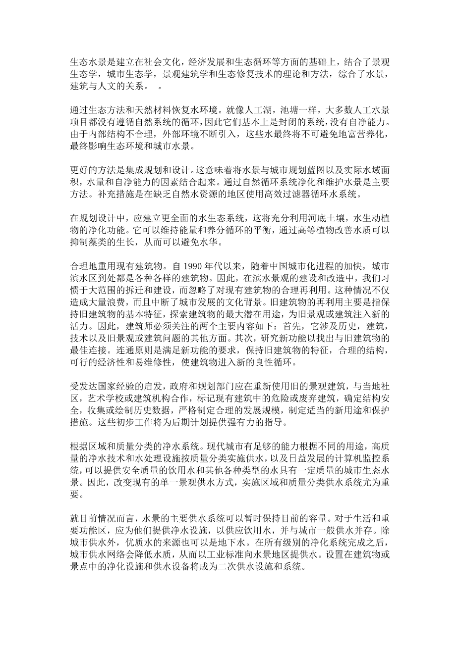 现代城市生态水景规划设计外文翻译资料 2023-02-09 14:12:33 英语译文共 10 页,剩余内容已隐藏,支付完成后下载完整资料 资料编号:[258963],资料为PDF文档或Word文档,PDF文档可免费转换为Word 原文和译文剩余内容已隐藏,您需要先支付 30元 才能查看原文和译文全部内容!立即支付 发小红书推广免费获取该资料资格。点击链接进入获取推广文案即可: Ai一键组稿 | 降AI率 | 降重复率 | 论文一键排版 PREVIOUS NEXT 您可能感兴趣的文章 颜色和设计:从自然图案到单色枸图外文翻译资料 度假酒店室内空间设计 色彩研究与应用外文翻译资料 规划法规与开发实践的碰撞:亚热带澳大利亚布里斯班的多层公寓建筑外文翻译资料 现代城市生态水景规划设计外文翻译资料 温泉度假酒店室内外空间一体化设计研究外文翻译资料 城市滨水景观设计发展研究外文翻译资料 城市滨水空间工业废弃地景观再生策略研究——以厦门岛西北门户片区为例外文翻译资料 纪念性建筑室内空间中隐喻表达的概述外文翻译资料 情感与室内空间设计:人体工程学视角外文翻译资料 建筑几何在能源性能模拟中的获取外文翻译资料