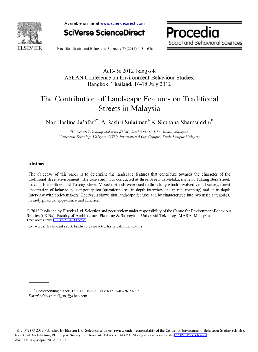 这里的景观是指伦敦克罗伊登区(2009年)提出的软质和硬质景观,其中软质景观特征是代表自然的景观要素,如植物、水和地形(伦敦克罗伊登区,2009年)。然而,硬景观被归类为旨在补充软景观的人造特征(Hussain和Ahmad,2010年)。街道被定义为封闭空间,以便通过建筑物、树木、墙壁或这些元素的任何组合产生运动(Moughtin,2006;Jacob A.1993)。传统来自于“传统”,代表着一代人到另一代人的重复,这与“时间”和“遗产”的概念有关。这两个概念对于创造一种独特的氛围至关重要,这种氛围将传统街道和新街道区分开来,优先考虑当地需求(Ja#39;Afar,2006;Shuhana等人2007)。它还显示了其自身的身体和精神方面的力量(Samadi等人2012)。在这项UCS研究中,遗产的概念指的是历史时期的地方,它描绘了自己的发展和变化,这可以通过其形态,社会和经济因素看到(DPUD西澳大利亚,1995年;Wrexham县行政区议会,2009年)。另一方面,联合国教科文组织将“遗产”定义为一种价值,这种价值从一代传到下一代,包括有形和无形方面。有形方面指建筑和景观等“硬件”要素,无形方面指社会模式、活动、文化等“软件”要素(Gottman J 1978)。因此,这两个概念(时间和遗产)的结合创造了一个环境,反映了“天才所在地”或地方精神,用户可以感觉到。