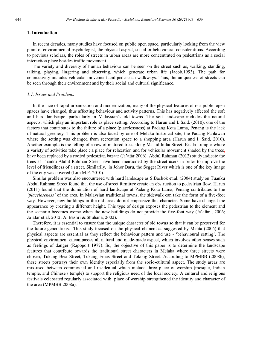 近几十年来,许多研究都集中在公共开放空间,特别是从环境心理学家、物理方面、社会或行为方面的考虑来看。以往学者认为,城市街道在交通活动之外,其作用更集中于行人作为社会互动场所。在街上可以看到人类行为的多样性和多样性,如行走、站立、交谈、玩耍、逗留和观察,这些都会产生城市生活(Jacob,1993)。连接道路包括车辆行驶和行人通道。因此,街道的独特性可以从其环境和社会文化意义上看出来。