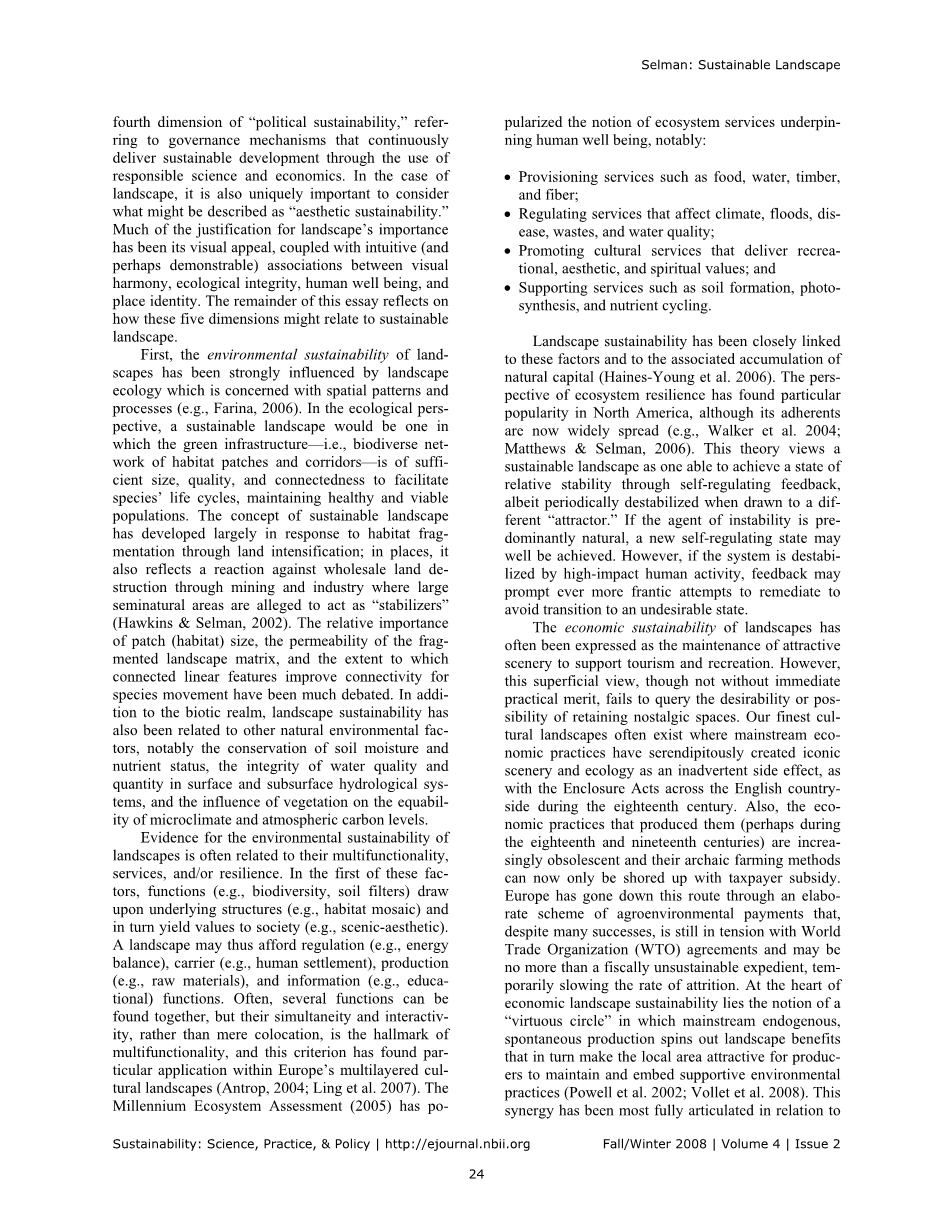 景观环境可持续性的迹象通常与它们的多功能性、服务或恢复力有关。在第一个因素中,功能(例如生物多样性、土壤过滤器)利用底层结构(例如栖息地的马赛克),并将其价值转化给社会(例如风景美学)。因此,景观可以提供调节(如能量平衡)、载体(如人类居住)、生产(如原料)和信息(如教育)功能。通常同时具备几个功能,而它们的同时性和交互性,不是仅仅是搭配,而是多功能的标志,这一标准在欧洲多层次的文化景观中找到了特别的应用(Antrop, 2004;凌et al . 2007年)。千年生态系统评估(2005)有将生态系统服务的概念作为支撑人类福祉的概念,值得注意的是: