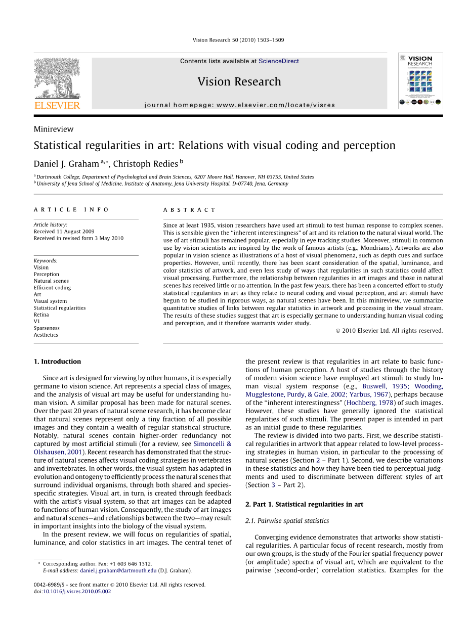 审查分为两部分。首先,我们描述了与人类视觉中的低级处理策略相关的艺术作品中的统计规律性,特别是与自然场景的处理(第2部分 - 第1部分)相关。其次,我们描述这些统计数据的变化,以及它们如何与感性判断联系起来,并用于区分不同风格的艺术(第3部分 - 第2部分)。