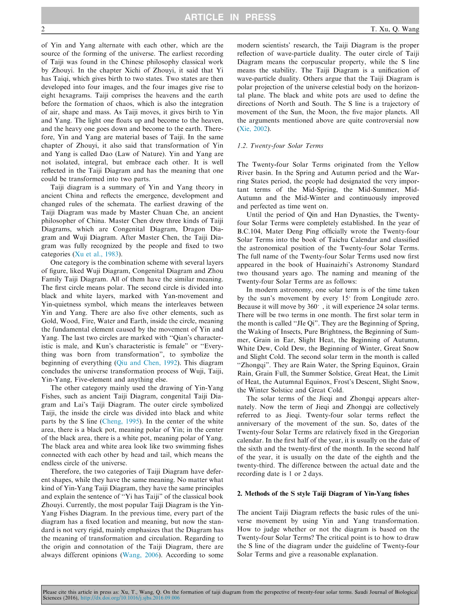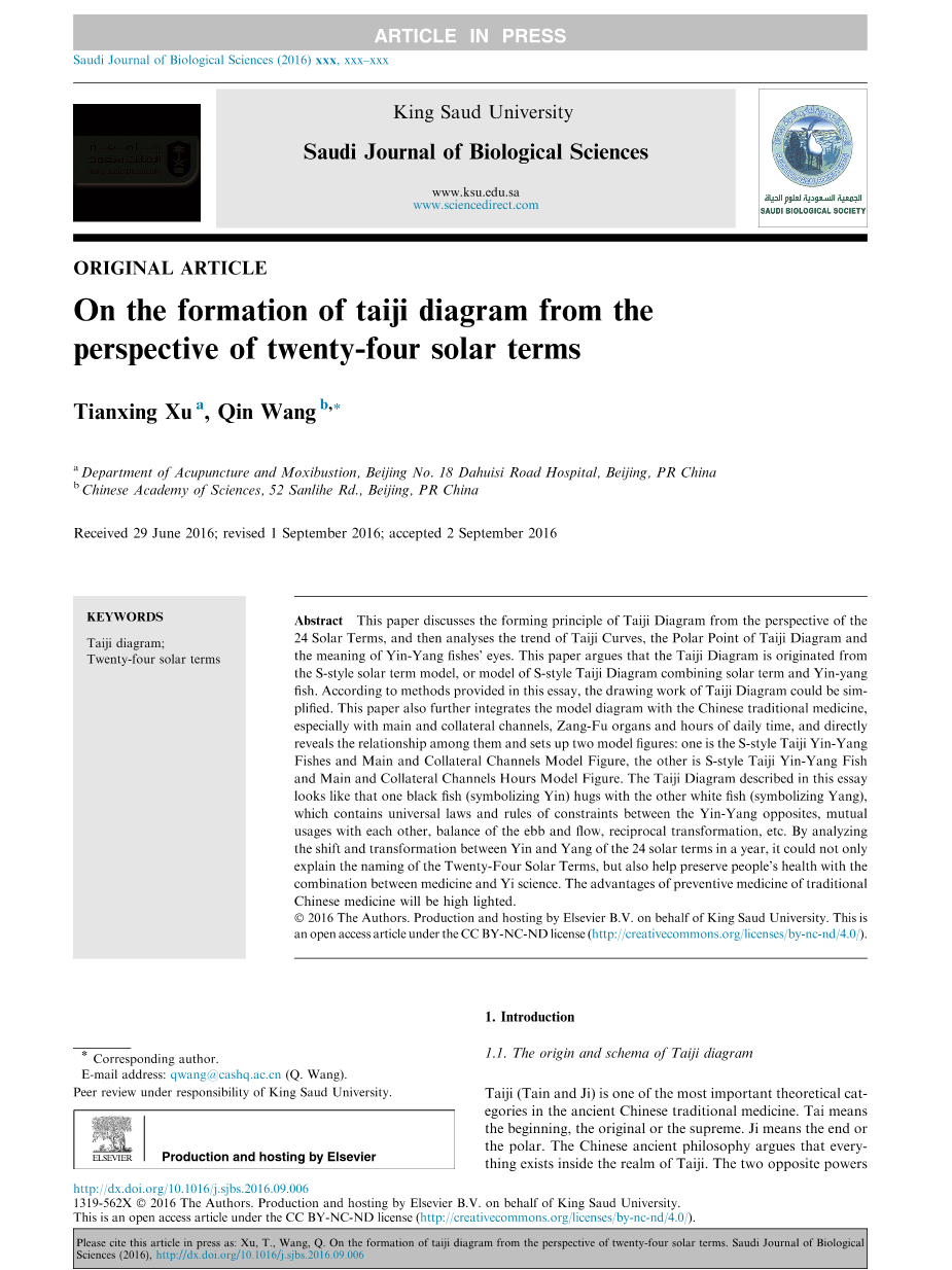 摘要本文从24节气的角度探讨了太极图的形成原理,分析了太极曲线的趋势,太极图的极点及阴阳鱼眼的意义。本文认为,太极图起源于S型太阳术语模型,而S型太极图结合太阳术和阴阳鱼两种模型。根据方法简化太极图的绘制工作,将模型图与中医药进一步整合,尤其与中外经络,脏腑器官与日常所用中药的整合,并直接揭示它们之间的关系,建立两个模型图:一种是S-式太极阴阳鱼及其主要和侧支渠道模型图,另一种是S型太极阴阳鱼及其主要和附带通道小时模型图。本文所描述的太极图看起来像一条黑色的鱼(象征着阴)与其他白色的鱼(象征着阳)拥抱,它包含了阴阳对立面之间的约束规律和规则,相互之间的相互作用、涨落平衡,通过分析一年中24个节气的阴阳变化,不仅可以解释“二十四节气”的命名,还有助于医学与彝学相结合,保持人体健康。中医预防医学的优势将得到高度的重视。