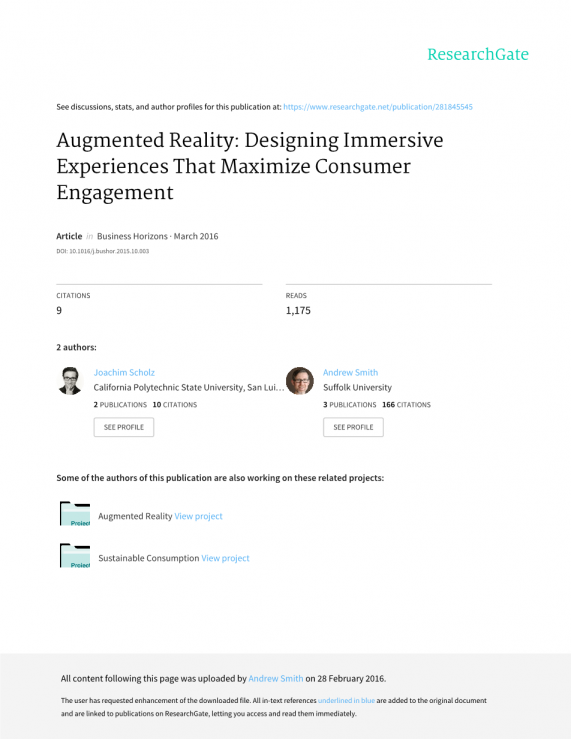 Keywords:augmented reality;关键词: 增强现实; advertising;广告; branding;品牌; consumer engagement;消费者参与; interactive marketing;互动营销; mobile marketing;移动营销; social media;社交媒体; user-generated content;用户生成内容; virtual reality虚拟现实