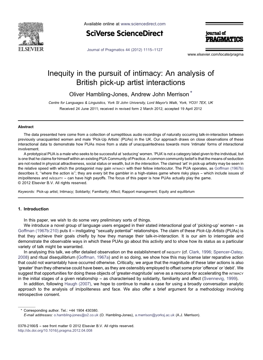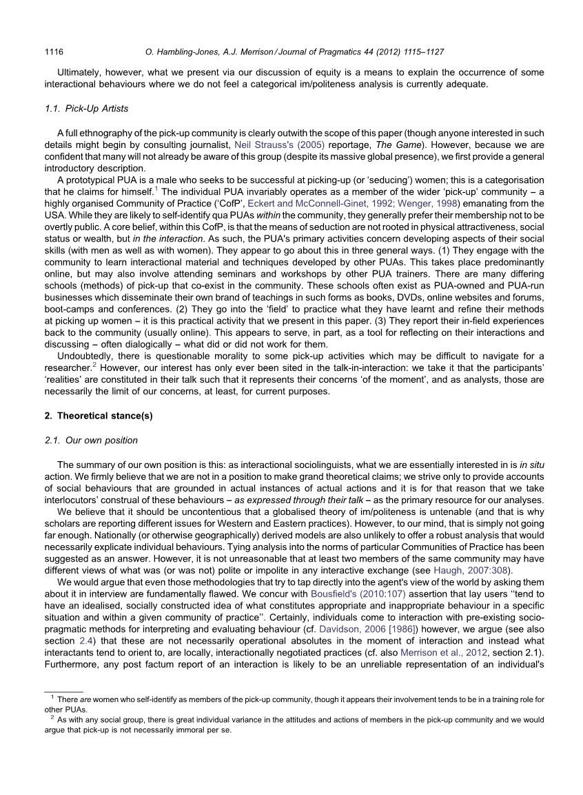 我们介绍了一群新颖的语言使用者,他们致力于“挑逗”女性的互动目标——正如高夫曼(1967年)所说——激发“性潜力”关系。这些“泡良族”(PUA)的说法是,他们实现目标的主要方式是如何管理他们的“交谈互动”(talk-in-interaction)。我们的目的是询问和演示这些PUA进行这种活动的可观察的方式,并说明它作为一种特殊的谈话的地位是如何得到保证的。