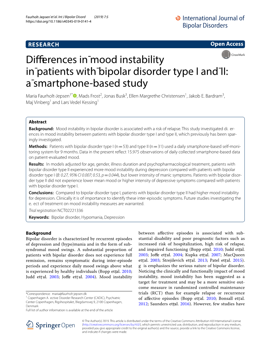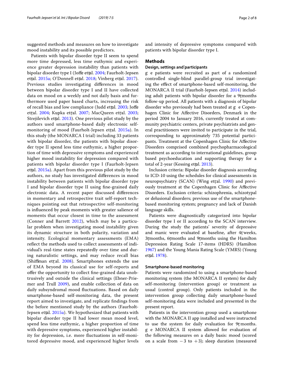 双相情感障碍II型的患者似乎花费了更多的时间,更短的时间和经验Greatate R抑郁症不稳定性:I型双相情感障碍患者(Jofeetal.2004;Faurholt-Jepsen等人2015A;O”Donnelletal.2018;Vinbergetal.2017)。调查Difrone的前一项研究 双相情感障碍类型I和II之间情绪的CES在每周和非每日的基础上收集了情绪数据,并且还使用了基于纸张的图表,增加了召回偏倚和低组合的风险。 (Judd等人,2003;Jofe等人,2004;Kupka等人,2007;Macquen等人,2003;Strejiljevich等人,2013)。作者先前进行的一项试点研究使用了基于智能手机的日常电子自我ITO 情绪环(Faurholt-Jepsen等人)(2015年a)。在这项研究中(Monarca I试验)包括33例双相情感障碍患者,II型双相障碍患者花费的时间较少,时间较长。 与双相情感障碍I型患者相比,她的抑郁症状和情绪不稳定的时间比例更高(Faurholt-Jepsen等人)。(2015年a)。除了 这是作者先前的先导研究,没有一项研究用fne颗粒每日电图研究双相情感障碍Ⅰ型和Ⅱ型患者在情绪不稳定方面的差异。 电子数据。最近的一篇文章讨论了瞬时和回顾性自我报告技术中的差异,指出回顾性自我监控是由峰值矩和更大的s构成的。 与评估最接近的时刻的存在(Conner和Barrett,2012年),这在调查情绪不稳定时可能是一个特殊问题,因为这两个组织的动态结构 特性、变化和强度。生态瞬间评估(EMA)是在自然主义时期反复收集个人实时状态评估的方法。 Ings,并可能减少回忆偏差(Shifman等人)。(2008年)。智能手机扩展了ema的使用范围,超出了传统的自报告用途,并提供了不引人注目地收集fne粒度数据的机会。 以及在临床设置之外(EBER-Primer和Trull2009),并且能够收集关于每日亚综合征情绪功能的数据。基于日常基于智能手机的自监控数据,Presen T报告旨在调查和复制作者的上述研究成果(FaurholtJepsen等人)。(2015年a)。我们假设II型双相情感障碍患者的比率较低。 平均情绪水平,较少的时间处于正常状态,有抑郁症状的时间比例较高,抑郁的不稳定性较高,即在自我监控的抑郁情绪中表现出更多的功能。 ,与I型双相情感障碍患者相比,患者的抑郁症状水平和强度更高。