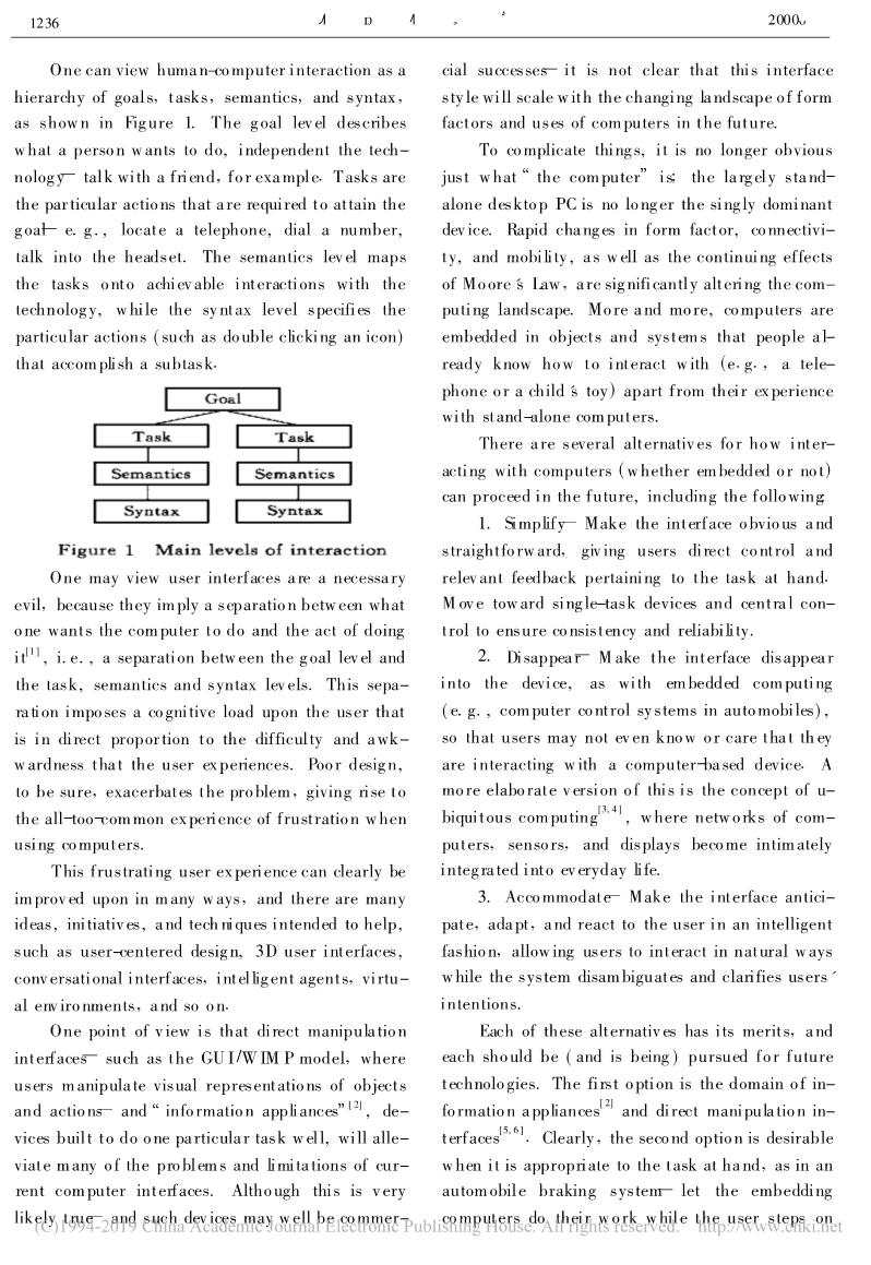 可以将人机交互视为目标,任务,语义和语法的层次结构,如图1所示。目标级别描述了一个人想要做什么,独立于技术 ,例如与朋友交谈。任务是实现目标所需的特定操作。 例如,找到一部电话,拨打一个号码,对着耳机说话。语义级别将任务映射到与技术可实现的交互,而语法级别指定完成子任务的特定操作(如双击图标)。