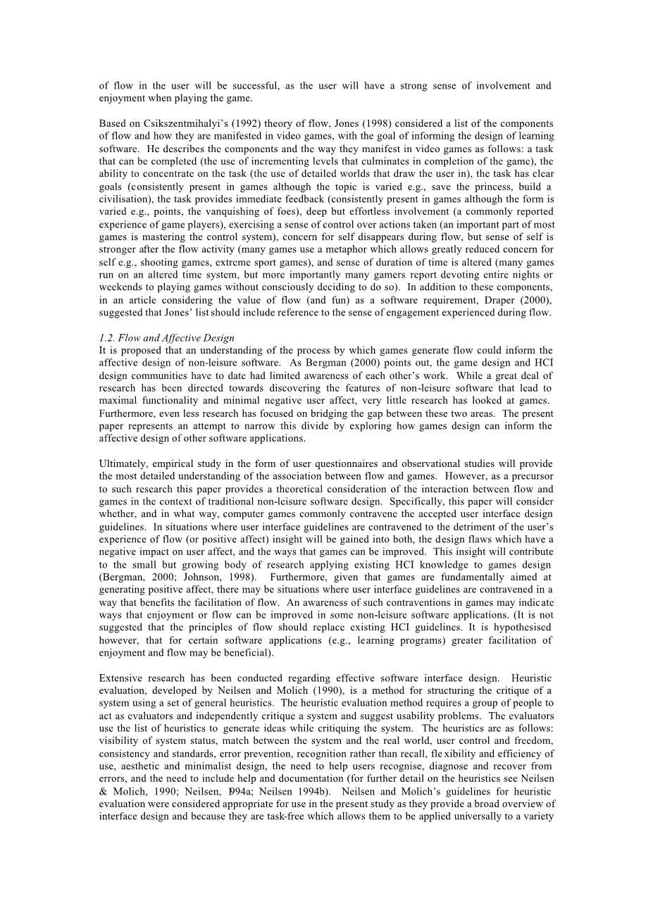 最后,用户问卷形式的实证研究和观测研究将提供“心流”与游戏之间关联的详细资料。无论如何,它作为此类研究的前提提供了一个在传统非休闲软件设计背景下“心流”与游戏之间相互作用的理论思考。具体来说,具体来说,本文将考虑是否以及在什么样的方式下,电脑游戏常见的违反了公认的用户界面设计原则,与在用户界面设计原则是违反用户“心流”的用户体验并对用户体验造成损害(或积极影响)或者将造成其二者的情况下,可能对用户造成负面影响的设计缺陷,并提出游戏设计可以改善的方向。这种领悟将有助于小但是正在成长研究机构将的现有人机交互知识适用于游戏设计(伯格曼,2000;约翰逊,1998)。此外,鉴于游戏基本上都是产生积极的影响,可能有情况是用户界面准则是违反“心流”便利传达的要求的。游戏中的这种矛盾的认识或许可以表示享受或“心流”在一些非休闲类软件应用设计中可以提高。(这并不表示“心流”的原则应取代现有的人机交互指南。这是假设,然而,对某些应用软件(例如,学习程序)更大的便利的享受和“心流”可能是有益的)。
