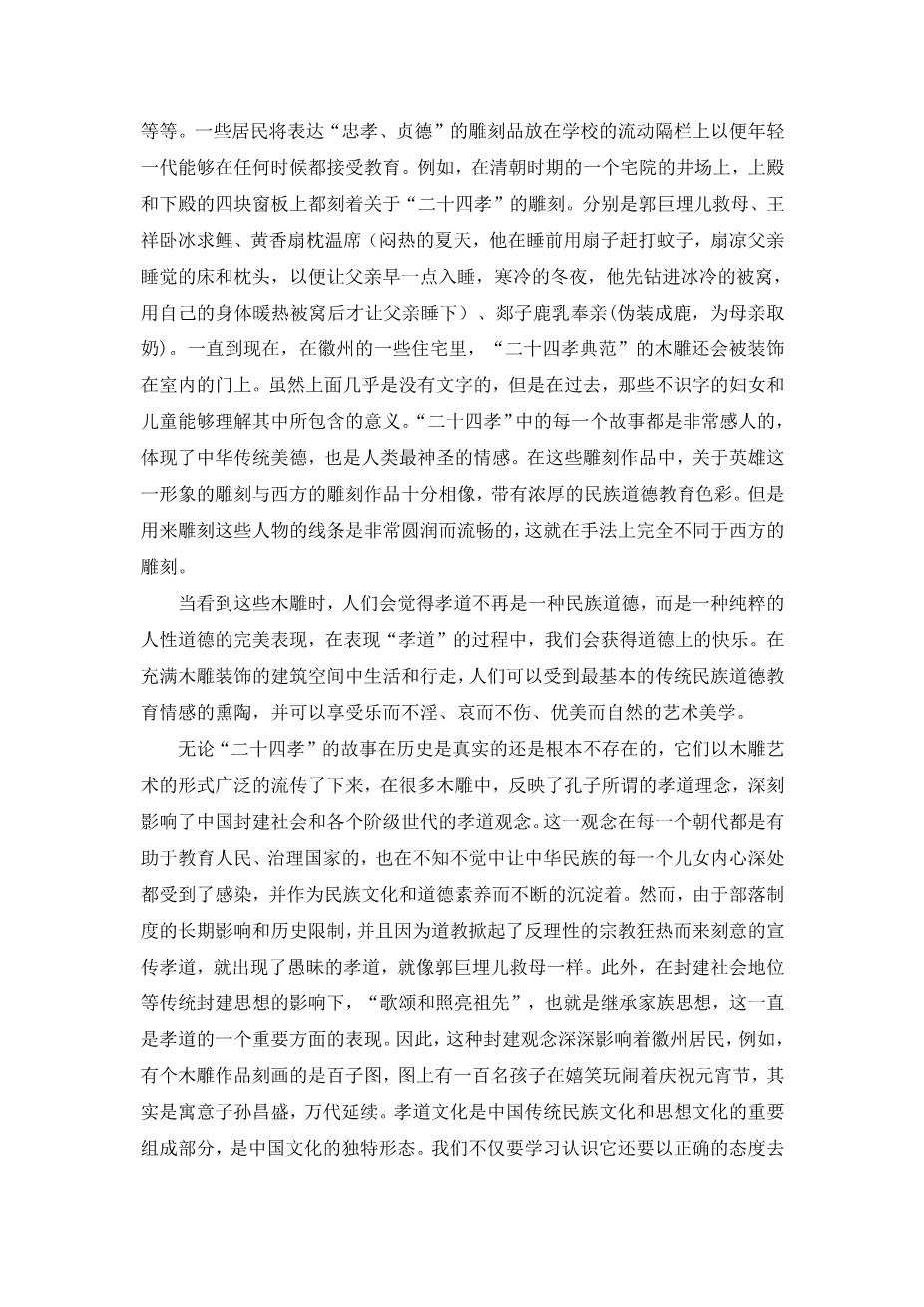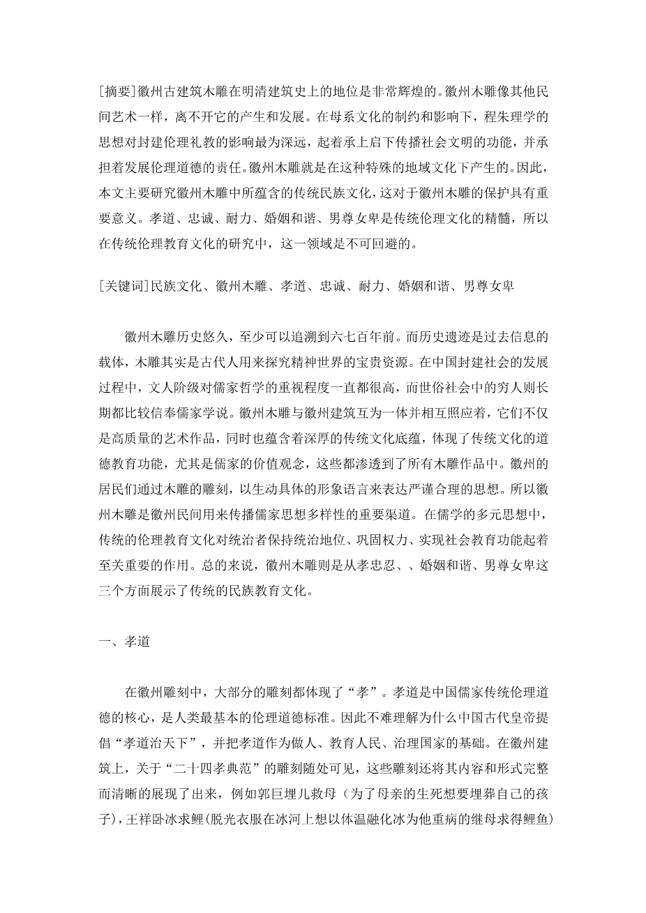 [Key words] Ethic culture, Huizhou wooden carving, Filial piety, Loyalty, Great endurance, Marriage harmony, Male superiority and female subjugation.