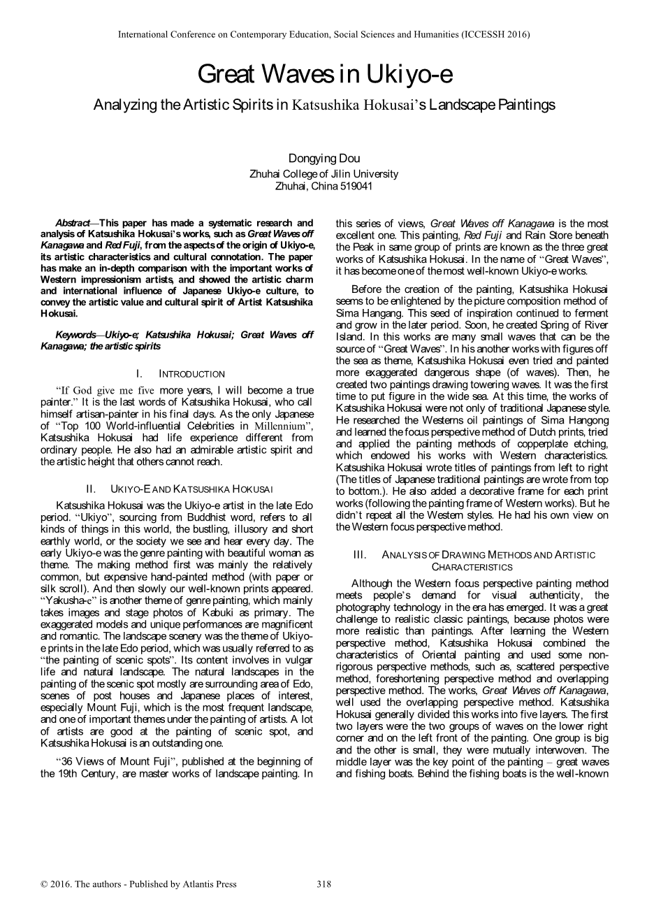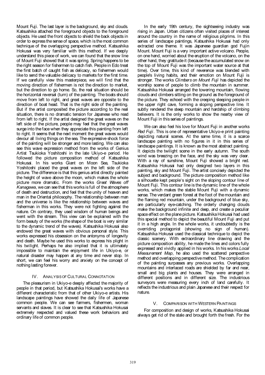 摘要: 本文对葛饰北斋的作品进行了系统的研究和探讨,比如《大浪退去》《神奈川冲浪里》《凯风快晴》,从浮世绘的起源,艺术特征和文化内涵方面和西方印象派艺术家进行了深入地比较,并显示出艺术魅力以及日本浮世绘文化的国际影响,传达艺术家葛饰北斋的艺术价值和文化精神。