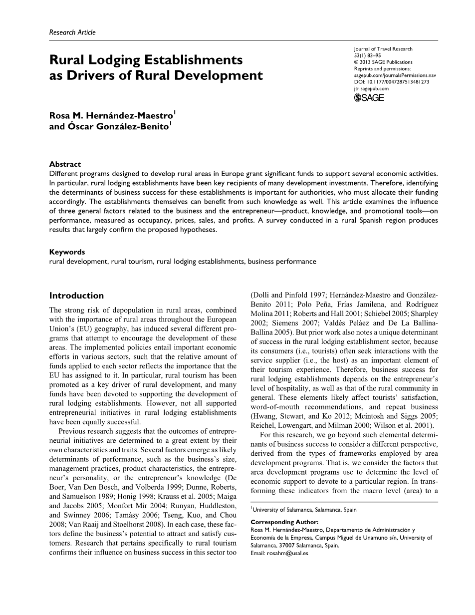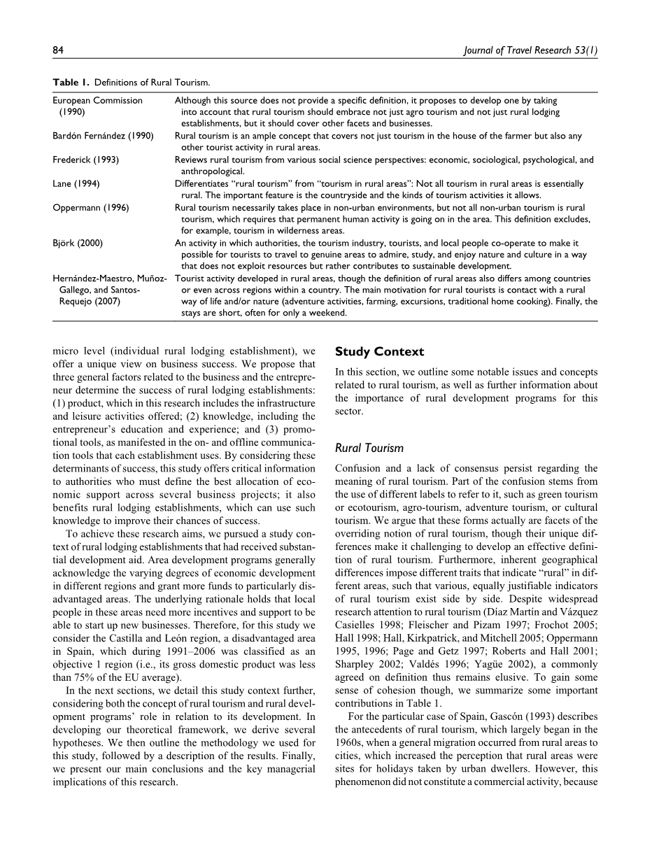 先前的研究表明,企业家创业的结果在很大程度上取决于他们自己的特点和特点。有几个因素可能成为业绩的决定因素,如企业的规模、管理实践、产品特征、企业家的个性或企业家的知识(De Boer, Van Den Bosch, and Volberda 1999;邓恩、罗伯茨和萨缪尔森1989;韩起澜1998;Krauss等人2005;麦加和雅各布斯2005;Monfort涉嫌米尔2004;Runyan, Huddleston, and Swinney 2006;Tamasy 2006;曾、郭、周2008;2008年)。在每种情况下,这些因素决定了企业吸引和满足顾客的潜力。专门针对乡村旅游的研究也证实了它们对这一领域商业成功的影响(Dolli和Pinfold 1997;2011年Hernandez-Maestro和Gonzalez-Benito;Polo Pena, Frias Jamilena和Rodriguez Molina 2011;罗伯茨和霍尔2001;西贝公司2005;Sharpley 2002;西门子2007;Valdes Pelaez和De La Ballina-Ballina 2005)。但是先前的工作也注意到农村住宿设施部门成功的一个独特的决定因素,因为它的消费者(即消费者)。,游客)经常寻求与服务供应商的互动(即作为旅游体验的重要组成部分。因此,农村住宿企业的成功取决于企业家的好客程度,以及整个农村社区的好客程度。这些因素可能会影响游客的满意度、口碑推荐和回头客(Hwang, Stewart, and Ko 2012;Mcintosh和Siggs 2005;Reichel, Lowengart和Milman 2000;Wilson等。