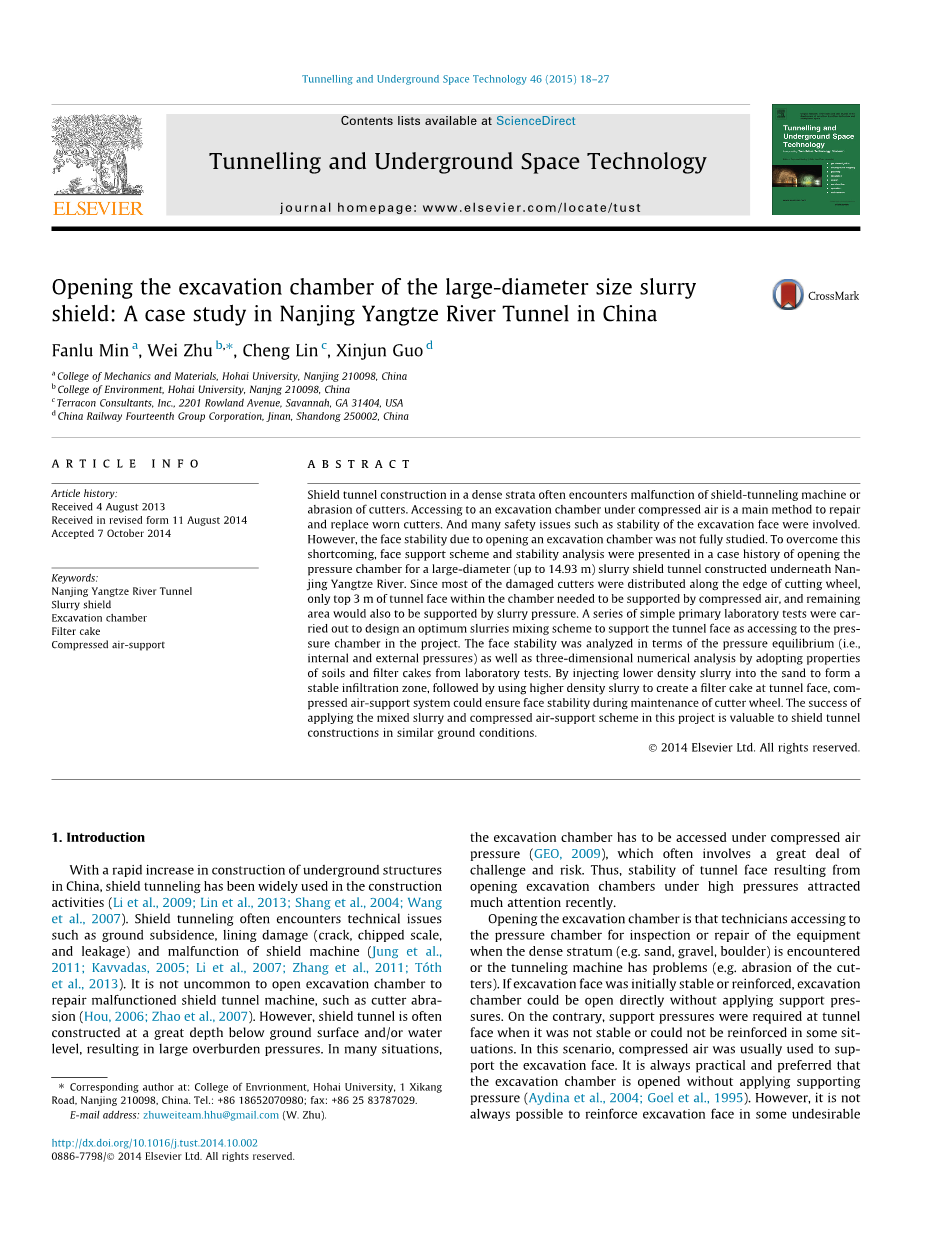 Key words: Nanjing Yangtze River Tunnel; Slurry shield; Excavation chamber; Filter cake; Compressed air-support
