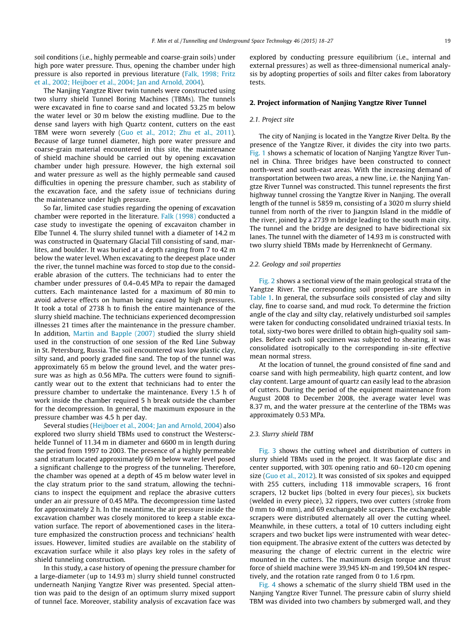 南京长江双隧道是使用两台泥水盾构隧道掘进机(TBM)建造的。隧道在细砂至粗砂中开挖,位于水位以下53.25 m或现有泥线以下30 m。由于石英层中的致密砂层,东部TBM上的刀具严重磨损[19, 20]。由于隧道直径大,孔隙水压力高和该地点遇到的粗粒物料,应通过在高压下打开开挖室来进行盾构机的维护。然而,过高的土压力和水压力以及高渗透性的沙子导致打开压力室困难,例如开挖面的稳定性,以及在高压下维护期间技术人员的安全问题。