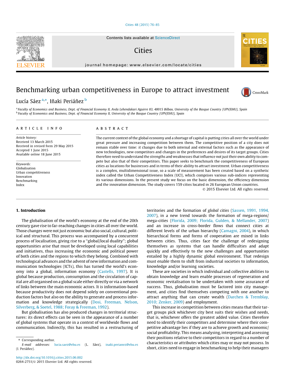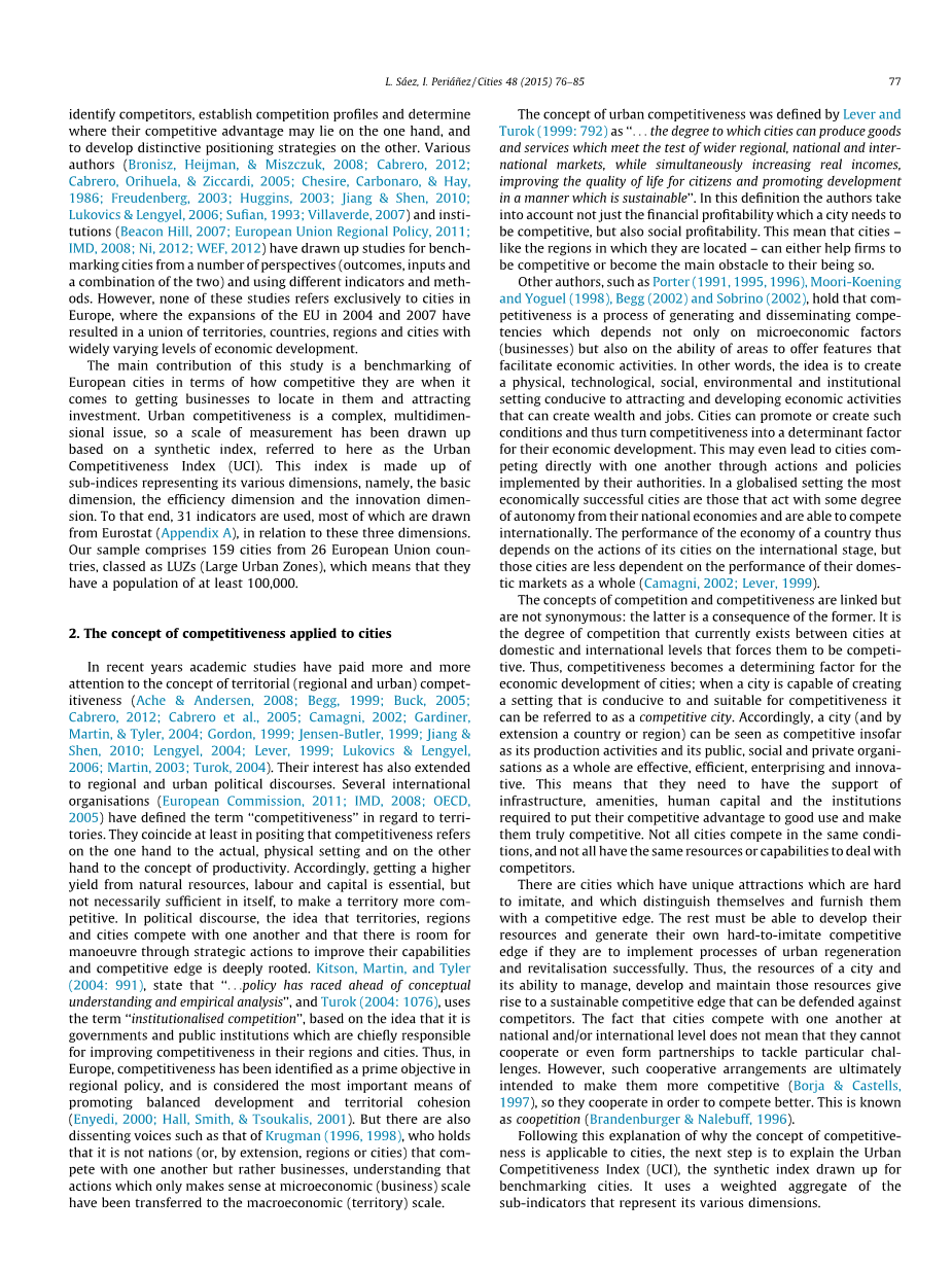 本研究的主要贡献是得出一个欧洲城市竞争力基准,并且研究它们是如何让企业定位和吸引投资。城市竞争力是一个复杂的,多维度的问题,所以测量的规模已经基于综合指数建立了,这里称之为城市竞争力指数(UCI)。这个指数是由指数代表它的各种维度,即基本维度,效率维度和创新维度。为此,这三个维度中的31个指标大多数是来自欧盟统计局(附录A)。样本包括26个欧盟国家的159个城市,称之为IUZS(大型城市区域),这意味着他们有至少100000人口。