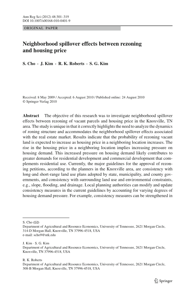 摘要:本研究旨在探讨田纳西州诺克斯维尔地区空置土地重新分区与房价之间的邻里溢出效应,以期正确分析分区结构的动态性,并适应与房地产市场相关的邻里溢出效应。结果表明,随着邻近地区房价的上涨,重新划分空置土地的可能性将增加。邻近地区房价上涨意味着住房需求压力加大。住房需求压力的增加可能导致对住宅开发和补充住宅用途的商业开发的需求增加。据诺克斯维尔地区的规划者说,目前,批准重新分区申请的主要指导方针是与州、市和县政府采用的长期和短期土地利用计划相一致,与周围土地利用和环境约束(如坡度、洪水和排水)相一致。地方规划部门可以根据不同程度的住房需求压力,修改和更新现行指南中的一致性措施。例如,一致性度量可以在