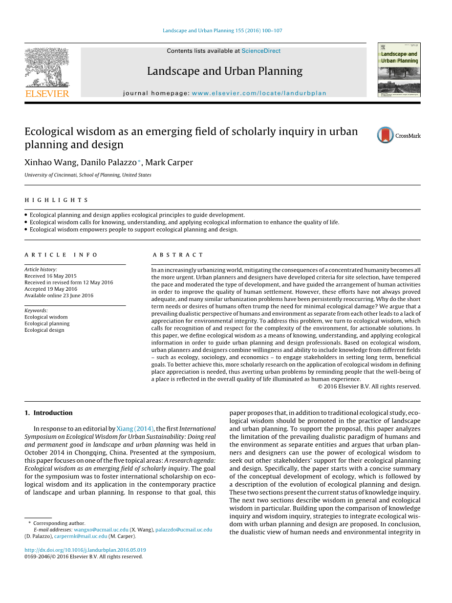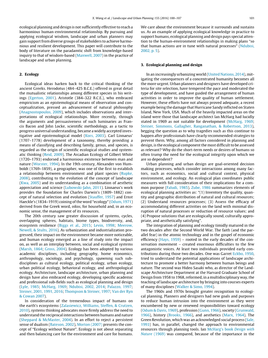 为响应Xiang在2014年的一篇社论,首届城市可持续发展生态智慧国际研讨会:在景观和城市规划中做真正和永久的好事,于2014年10月在中国重庆举行。在研讨会上,本文着重讨论了五个主题之一:生态智慧作为一个新兴的学术研究领域。研讨会的目的是促进生态逻辑智慧及其在当代景观和城市规划实践中应用方面的国际学术发展。针对这一目标,本文提出,除了传统的生态研究外,在景观和城市规划实践中也应该提倡生态逻辑智慧。为了支持这一提议,本文分析了当前人类与环境作为独立实体的二元范式的局限性,认为城市规划者和设计师可以利用生态智慧的力量,为他们的生态规划和设计寻求其他利益相关者的支持。具体来说,本文首先对生态学的概念发展进行了简要的概括,然后描述了生态规划设计的演变过程。这两部分介绍了知识探究的现状。接下来的两个部分描述了一般的智慧,特别是生态智慧。在比较知识探究与智慧探究的基础上,提出了将生态智慧与城市规划设计相结合的策略。综上所述,生态规划设计中关于人的需求与环境整体性的二元论观点并不能有效地实现人与环境的和谐关系。通过追求和应用生态智慧,景观和城市规划者可能会获得不同利益相关者群体的支持,以实现富有活力和弹性的发展。本文将对景观与城市规划实践中从基于知识的探究转向基于智慧的探究(Maxwell, 2007)的范式转变的文献体系做出贡献。