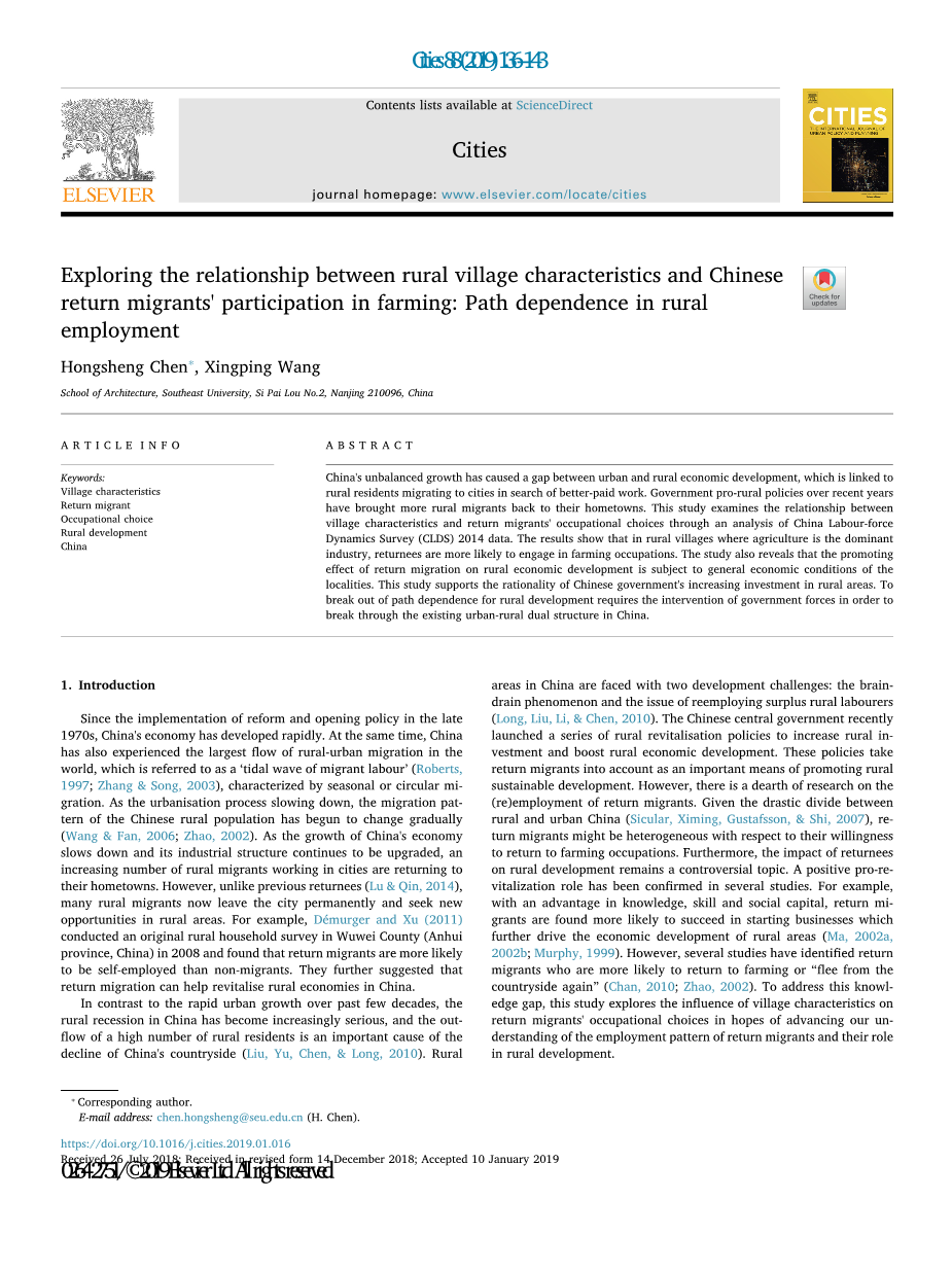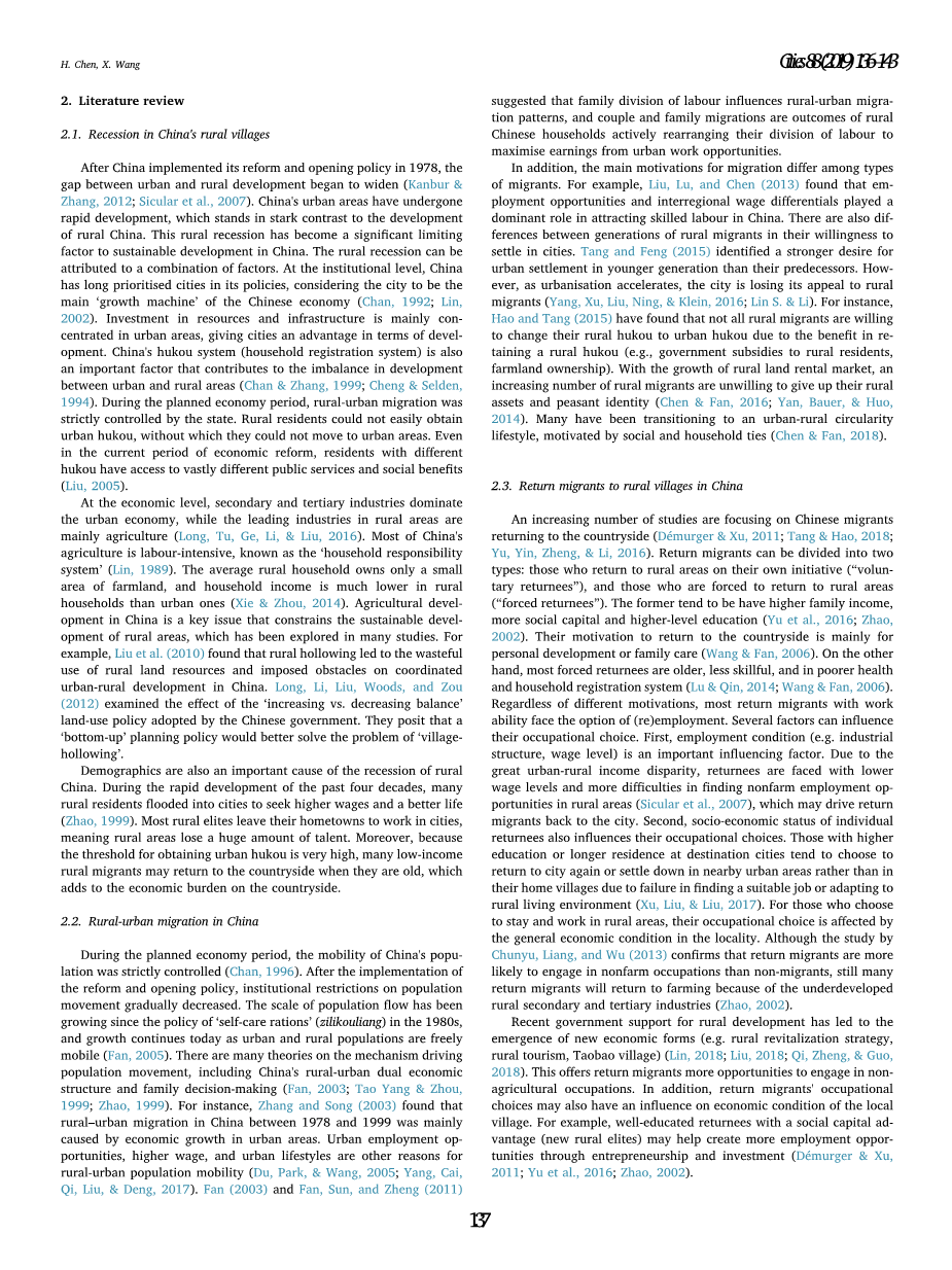 与过去几十年城市快速增长相比,中国农村经济衰退日趋严重,大量农村居民外流是中国农村衰落的重要原因(Long,Liu,Li,Chen,2010)。中国乡村地区面临着两个发展挑战:人才流失现象和重新获得农村剩余劳动力的问题(Long,Liu,Li,Chen,2010)。中国中央政府最近出台了一系列农村振兴政策,以增加农村投资,促进农村经济发展。这些政策将返乡移民作为促进农村可持续发展的重要手段。然而,对返乡移民再就业的研究很少。鉴于中国农村和城市之间存在巨大差距(Sicular,Ximing,Gustafsson,Shi,2007),返乡移民可能在回归农业职业方面存在差异。此外,返乡者对农村发展的影响仍然是一个有争议的话题。一些研究证实了积极的促进复兴作用。例如,凭借在知识,技能和社会资本方面的优势,返乡移民被发现更有可能成功开办企业, 进一步推动农村地区的经济发展(Ma,2002a,2002b; Murphy,1999)。然而,一些研究已经确定了返乡移民更有可能重返农业或“再次逃离农村”(Chan,2010; Zhao,2002)。为了解决这一认知差距,本研究探讨了村庄特征对返乡移民职业选择的影响,希望能够促进我们对返乡移民就业模式及其在农村发展中的作用的理解。
