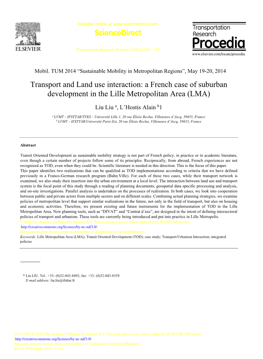 关键词:里尔大都会区(LMA); 公交导向发展(TOD); 案例分析; 交通/城市互动; 集成