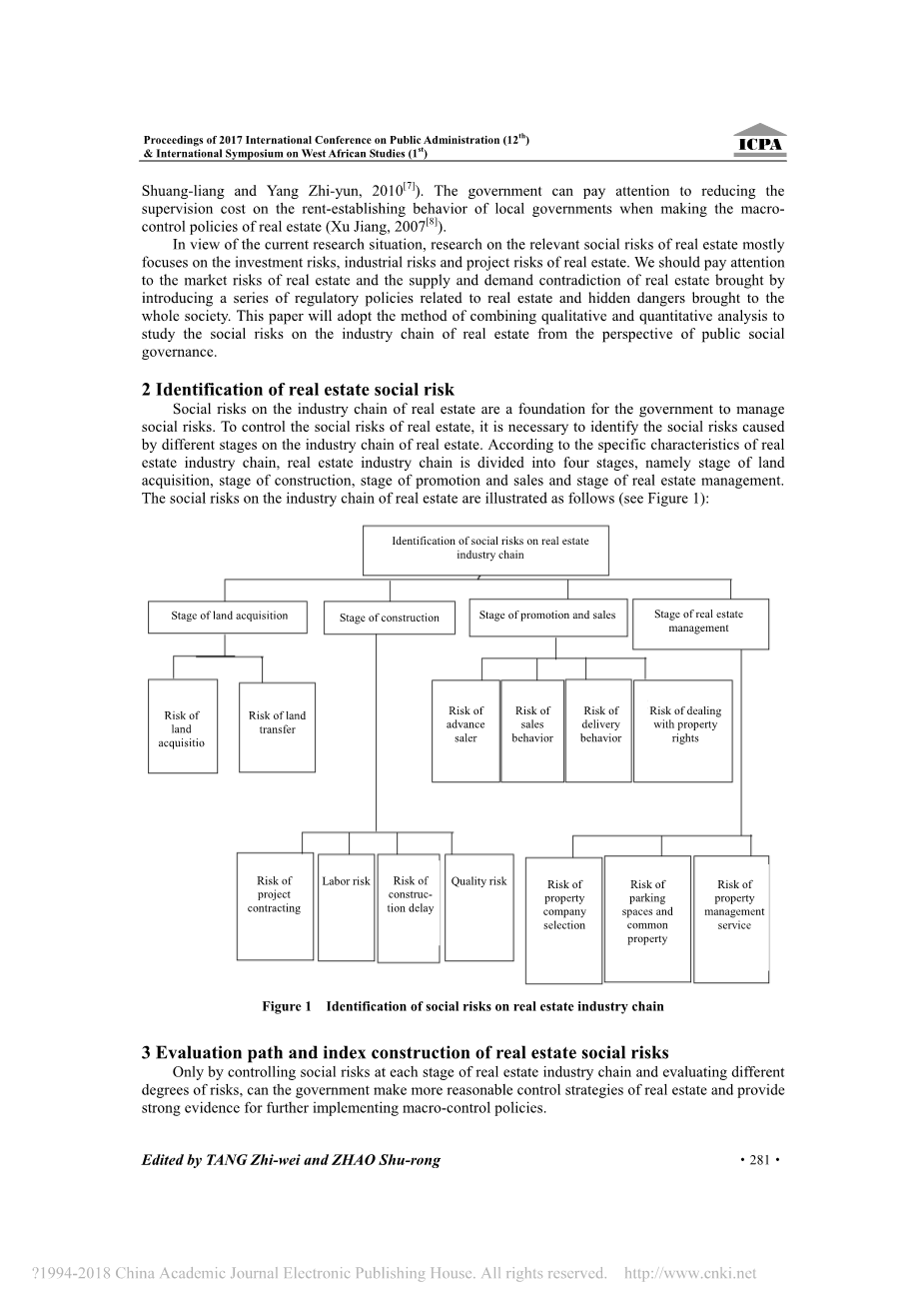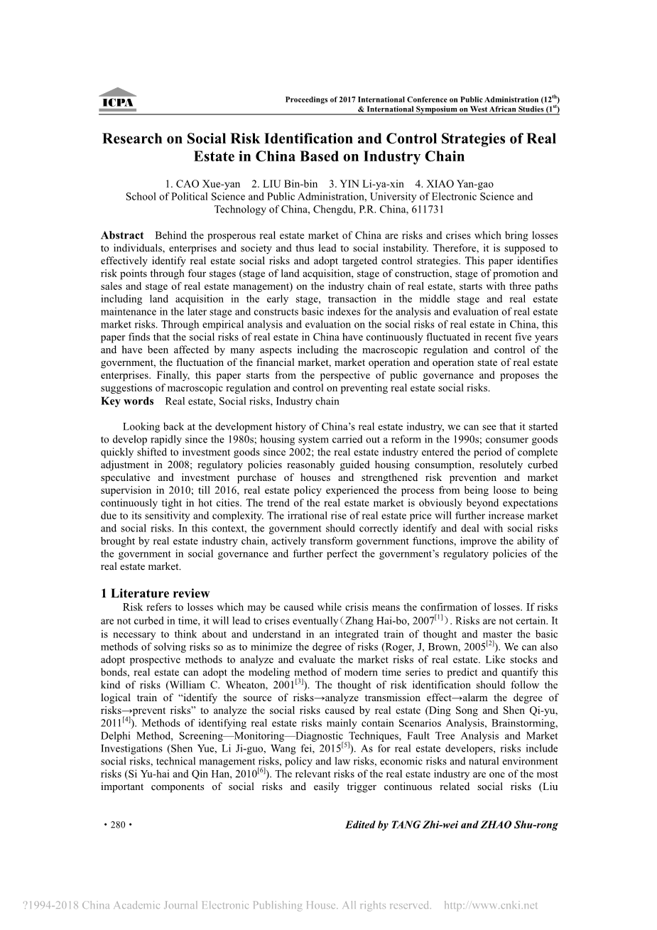 摘要 中国繁荣的房地产市场背后存在着风险和危机,给个人、企业和社会带来损失,从而导致社会不稳定。因此应该有效地识别房地产社会风险,并采取针对性的控制策略。本文通过四个阶段(土地征用阶段、建设阶段、销售阶段、房地产管理阶段),在房地产产业链上识别风险点,并构建房地产市场风险的分析评估的基本指标。房地产产业链包括早期阶段的征地、中期的交易和后期的房地产维护。本文通过对我国房地产社会风险的实证分析和评价,发现我国房地产的社会风险在近五年内不断波动,并受到政府宏观调控、金融市场波动、房地产企业市场运作和经营状况等诸多方面的影响。最后,本文从公共治理的角度出发,提出了宏观调控和防范房地产社会风险的建议。